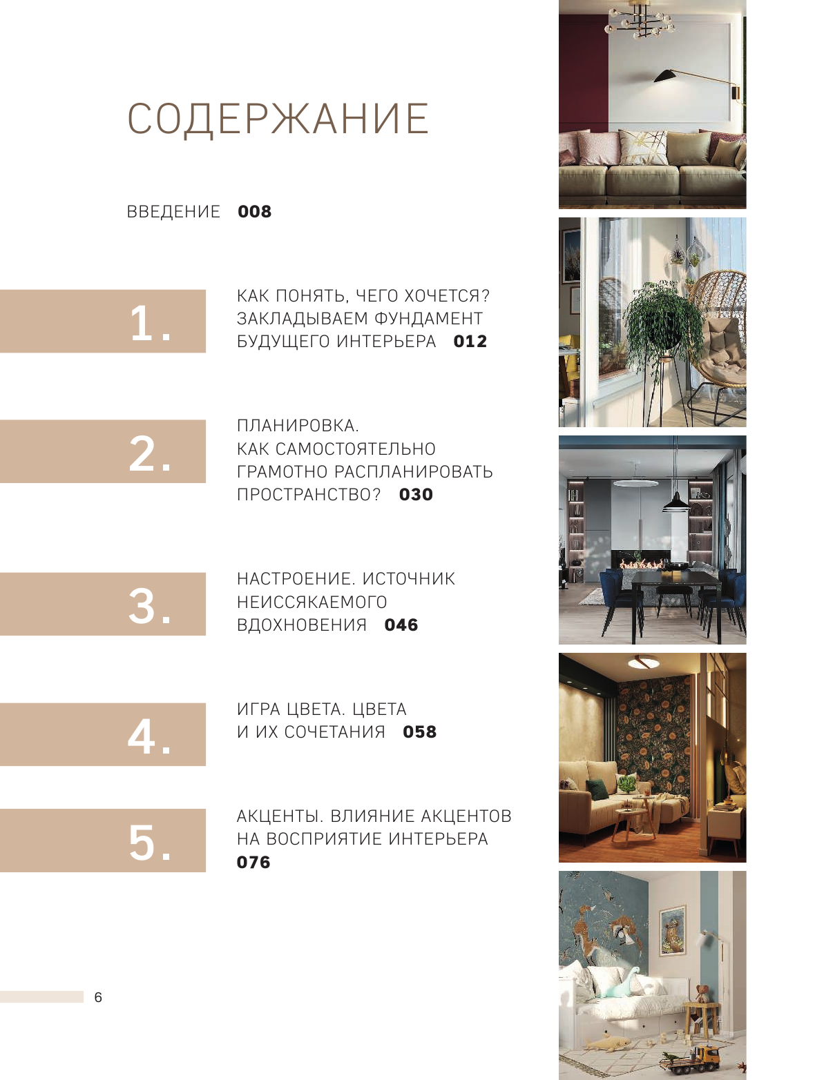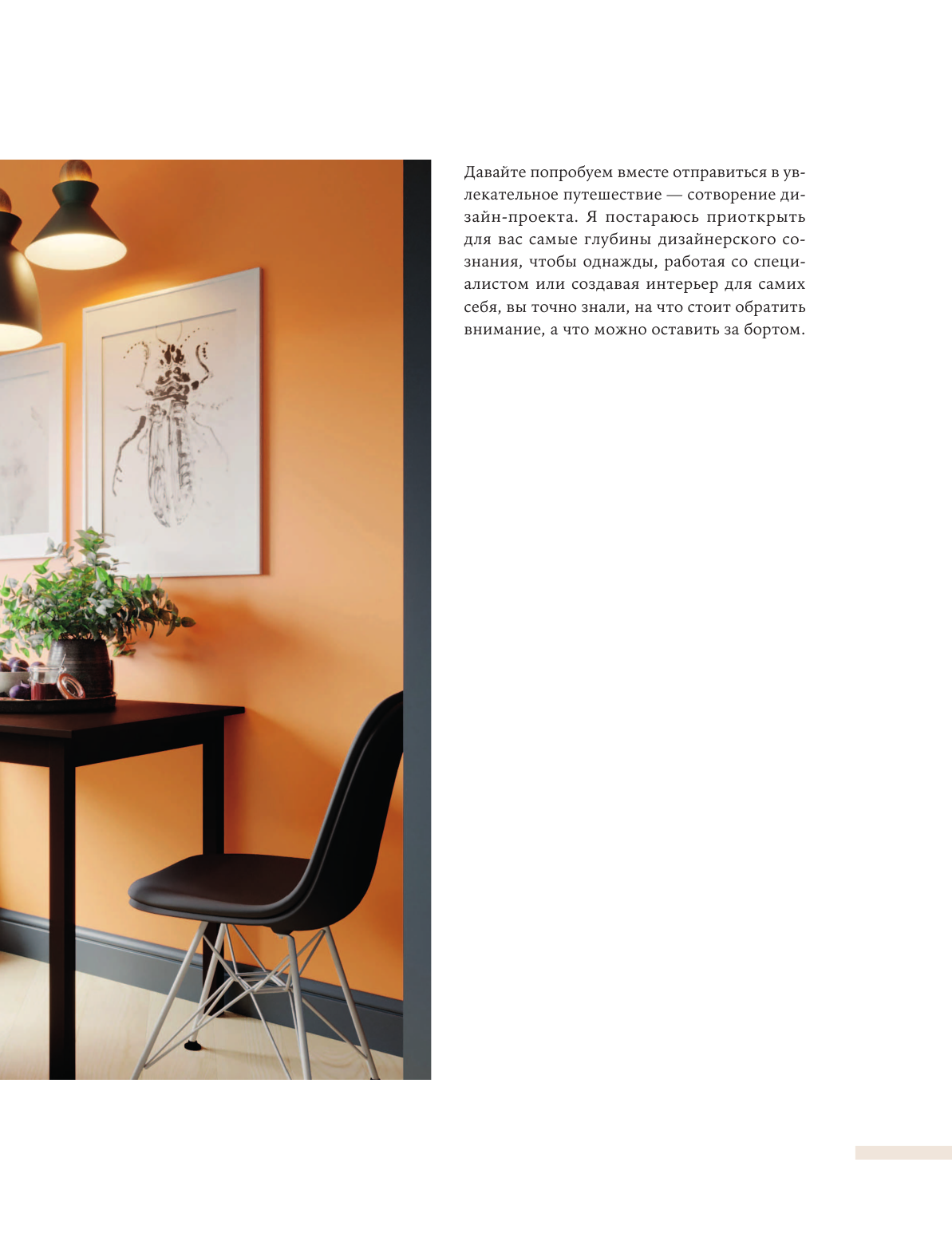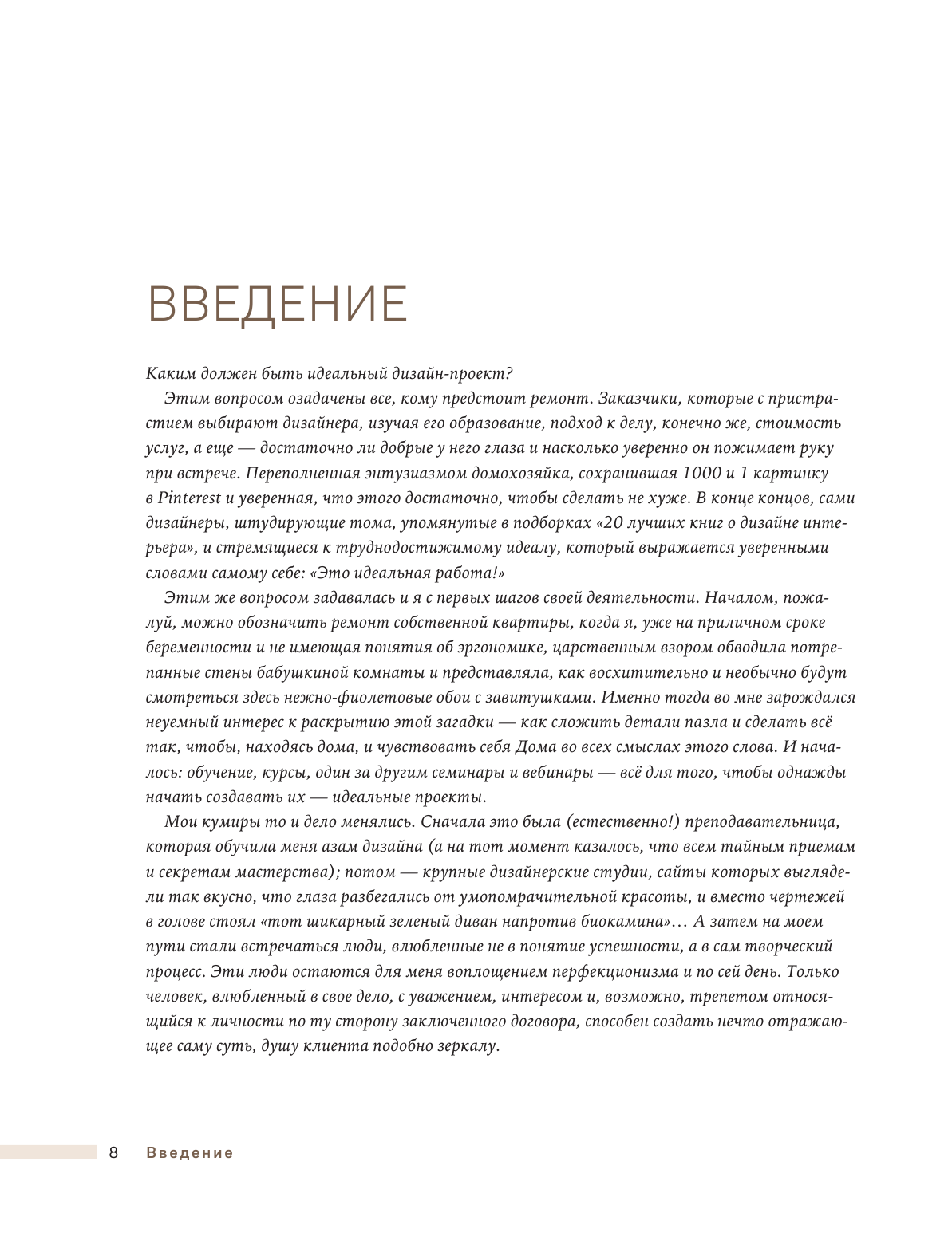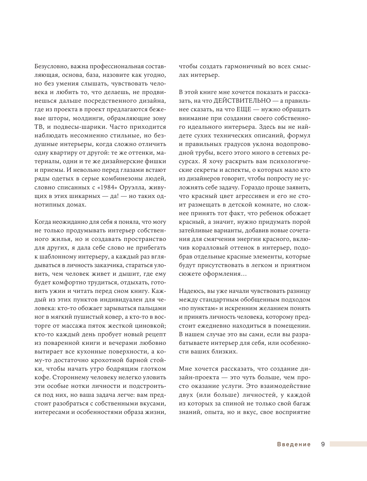 У меня уже небольшая коллекция книг по дизайну, и эту купила в первую очередь ради вдохновения - всегда ищу красивые иллюстрации и новые идеи для обустройства пространств. Книга не разочаровала! Интерьеры не совсем однотипные, как во многих подобных книгах, так что глазу есть за что зацепиться. Плюс, в тексте все тоже по делу. Отдельно замечу, что это вполне себе полноценный текст, тут есть и пошаговые рекомендации, и объяснения логики сочетания тех или иных предметов, которые представлены на фото. Поэтому, думаю, что книга подойдет и новичкам, кто только раздумывает над тем, как обустроить квартиру, и нуждается в поддержке и советах - тут все это есть.