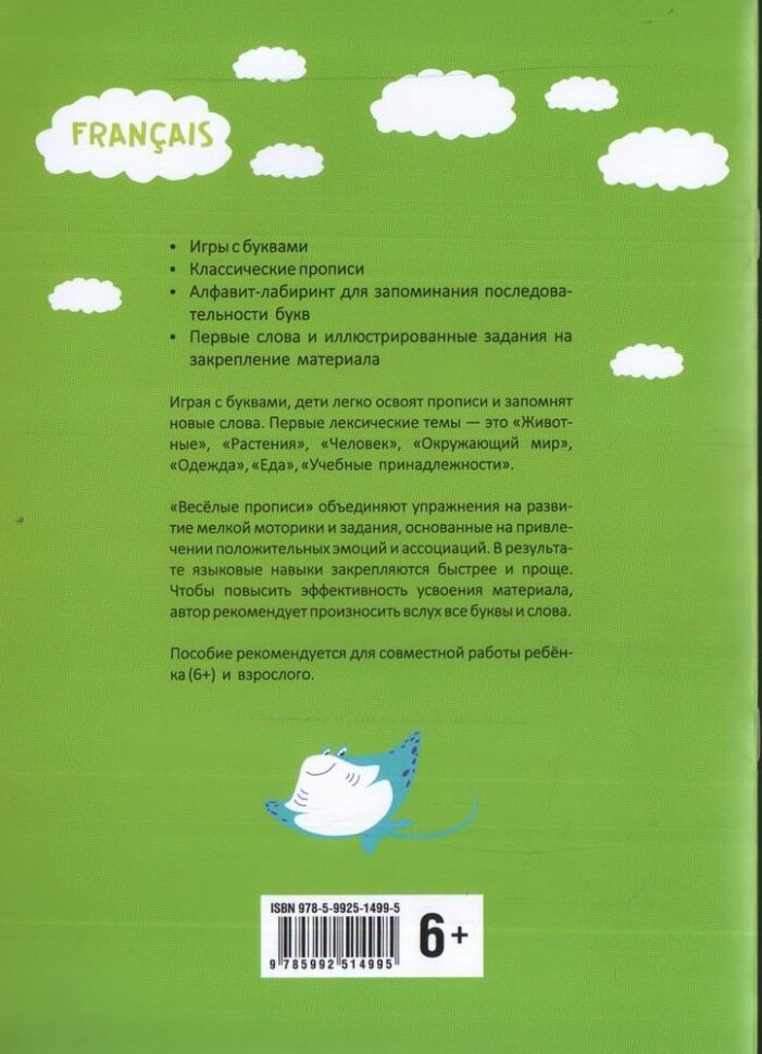 Играя с буквами, дети легко освоят прописи и запомнят новые слова. Первые лексические темы – это «Животные», «Растения», «Человек», «Окружающий мир», «Одежда», «Еда», «Учебные принадлежности». «Весёлые прописи» объединяют упражнения на развитие мелкой моторики и задания, основанные на привлечении положительных эмоций и ассоциаций. В результате языковые навыки закрепляются быстрее и проще. Чтобы повысить эффективность усвоения материала, автор рекомендует произносить вслух все буквы и слова. Пособие рекомендуется для совместной работы ребёнка (6+) и взрослого.