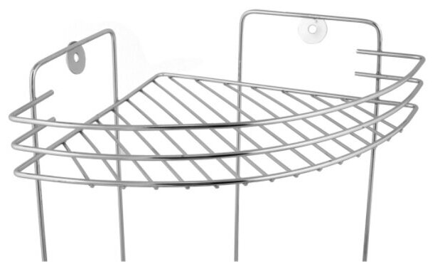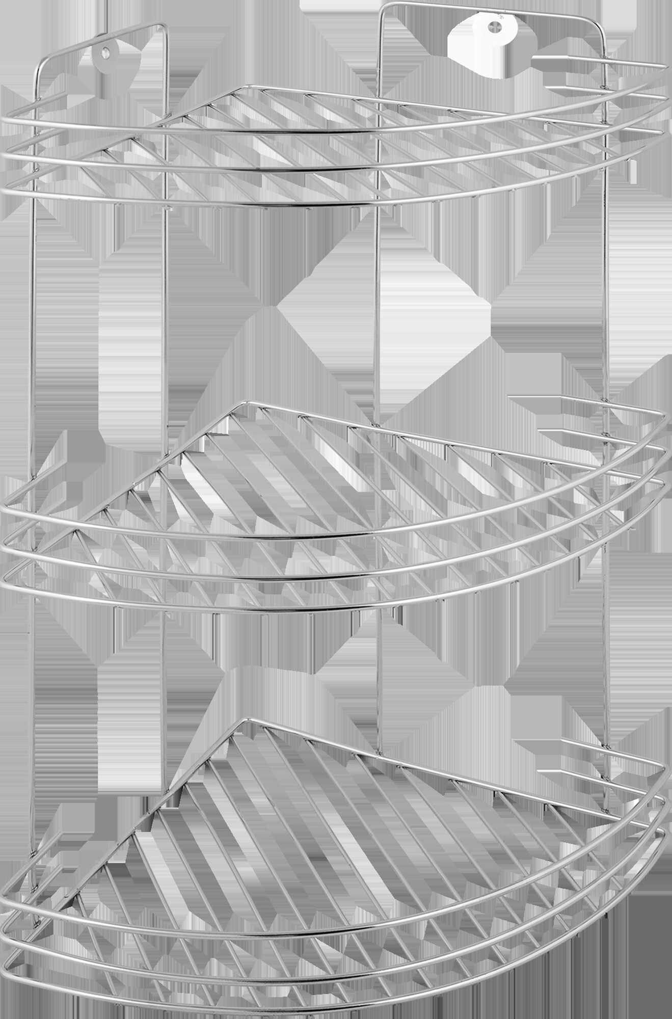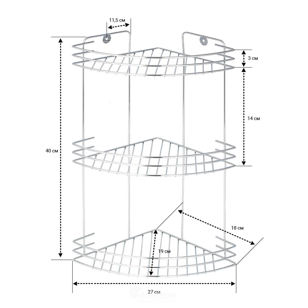 Полка для ванной настенная подвесная угловая трехъярусная металлическая. Защитное покрытие - хромирование. Монтируется к стене при помощи крепления, входящего в комплект. Расстояние от угла до крепления 11,5 см. Толщина прутьев 0,32 см;