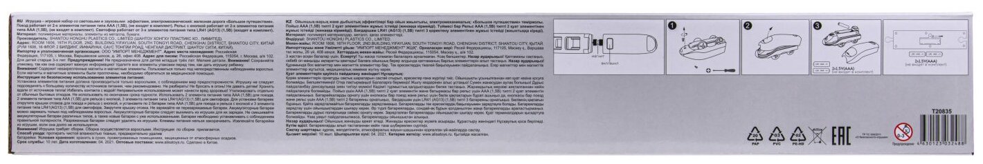 | Комплектация | локомотив - 2 шт, вагон - 1 шт, туннель, мост, человечек, машинки, дорожные знаки |