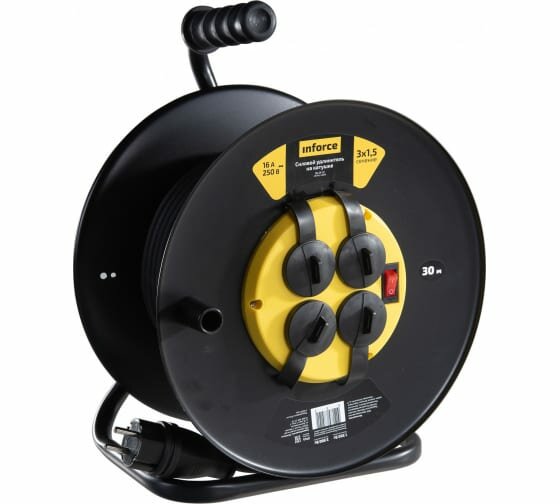 Сервис сравнения цен СкидкаГИД предлагает сравнить цены на товар «Силовой удлинитель Inforce на катушке, 4гн. с/з КГт 3х1,5 16A 30м IP 44 09-15-01 (черный)»