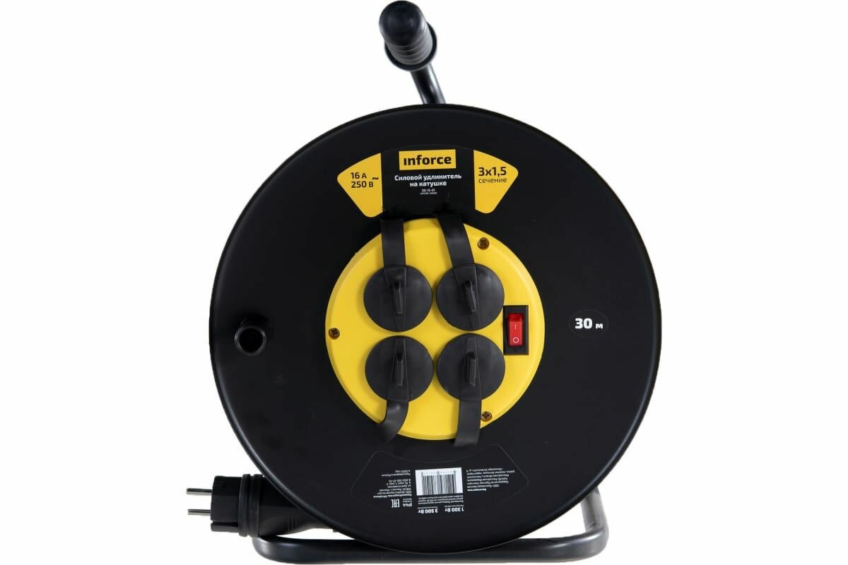 Силовой удлинитель на катушке Inforce 4 гнезда, с/з КГт 3х1,5 16A 30м IP44 09-15-01 предназначен для использования в тяжелых условиях. Удлинитель можно применять на стройках, на производстве, а так же на открытом воздухе. Прочный металлический корпус покрыт специальной порошковой краской. Провод КГ, используемый для удлинителя данного вида, устойчив к механическим повреждениям, так и к повреждениям в результате воздействия низкой температуры воздуха. Удлинители снабжены защитными крышками на розетках, они позволяют защитить контактную группу по стандарту IP44. Безопасность удлинителя обеспечивается за счет наличия термовыключателя, не позволяющего использовать изделие с превышением заявленных характеристик.