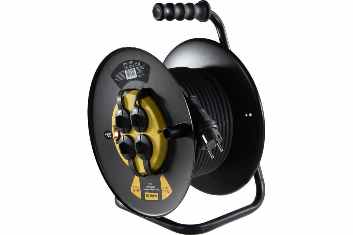 Силовой удлинитель Inforce на катушке, 4гн. с/з КГт 3х1,5 16A 30м IP 44 09-15-01 (черный)