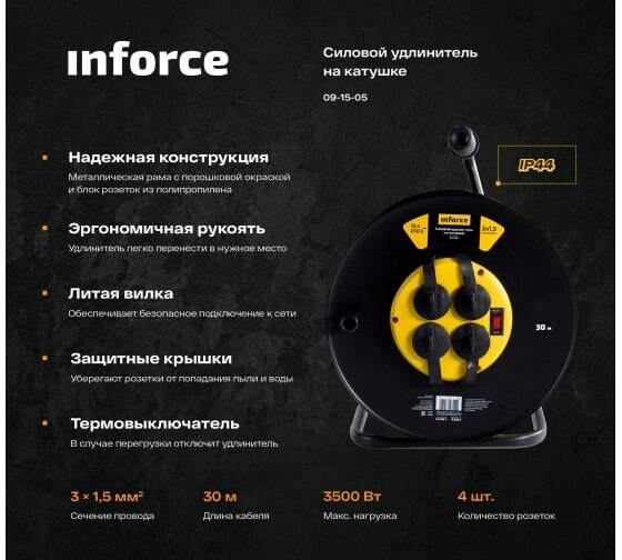 На сегодняшний день товар «Силовой удлинитель Inforce на катушке, 4гн. с/з ПВС 3х1,5 16A 30м IP 44 09-15-05 (желтый)» можно купить с кешбеком в 1 магазине: Яндекс.Маркет
