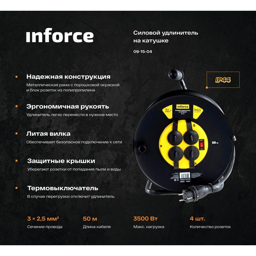 На сегодняшний день товар «Силовой удлинитель Inforce на катушке, 4гн. с/з КГт 3х2,5 16A 50м IP 44 09-15-04 (черный)» можно купить с кешбеком в 1 магазине: Яндекс.Маркет