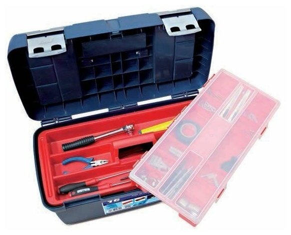 Ящик для инструментов с клубоким лотком, органайзером и двумя органайзерами в крышке. Размер 580х290х290 мм. Модель № 19 прекрасно подойдет для транспортировки и хранения большого количества разного ручного инструмента и мелкого крепежа. Ящик оснащен удобной ручкой. Крышка запирается на два металлических замка. Органайзеры в крышке обеспечивают легкую доступность к метизам, крепежу без необходимости открывать ящик. Это выбор автолюбителей, строителей, рыбаков, домашних мастеров и других людей, которые ценят надежность, качество и долговечность хороших вещей. Кроме того, этот ящик выдерживает нагрузку СВЕРХУ до 120 кг. Вес ящика: 3,40 кг.