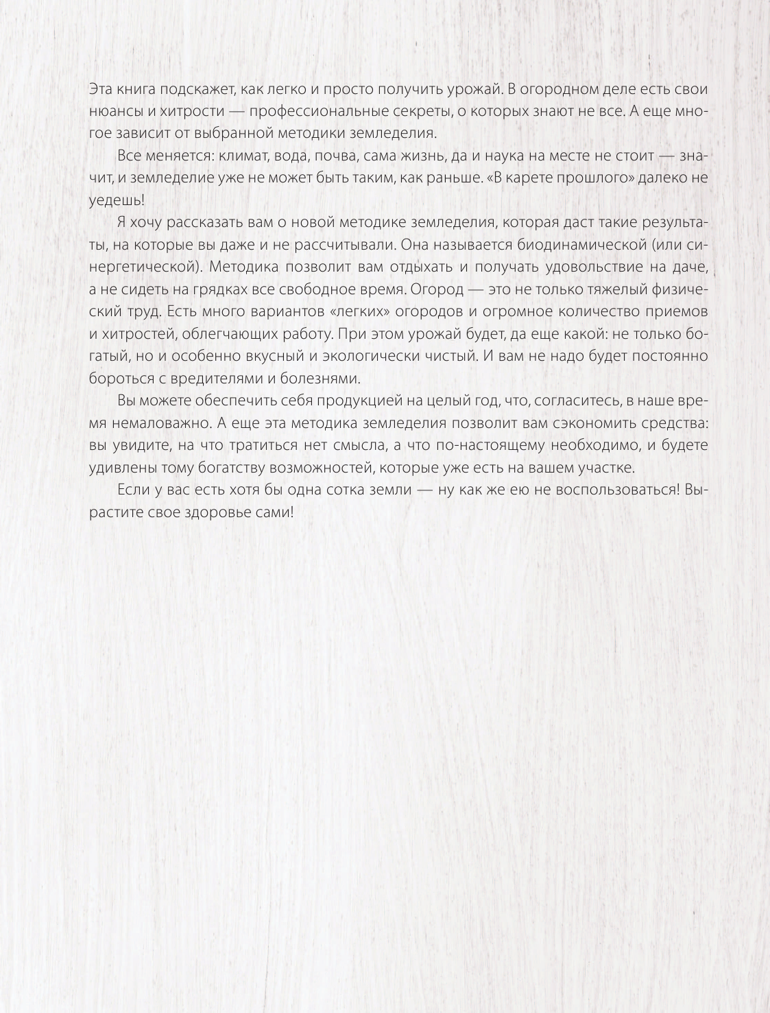 Автор этой книги предлагает собственную новую методику земледелия. И благодаря ей я без химикатов смогла сделать мой огород гораздо более урожайным, при этом не тратя на работу на грядках больше времени, чем обычно. Если вы расстроены тем, что огород, несмотря на ваши старания, не может похвастаться богатством, то эта книга - настоящее спасение! Она для тех, кто любит свой огород и видит, в чем преимущества самостоятельного выращивания овощей, корнеплодов и зелени. Автор - известная ведущая, которая компетентна в своём деле. Её советы всегда мне помогали. Незаменимое пособие для дачников.