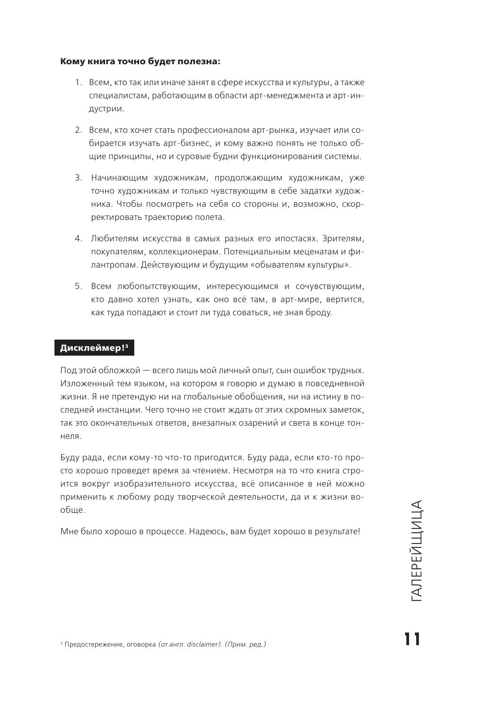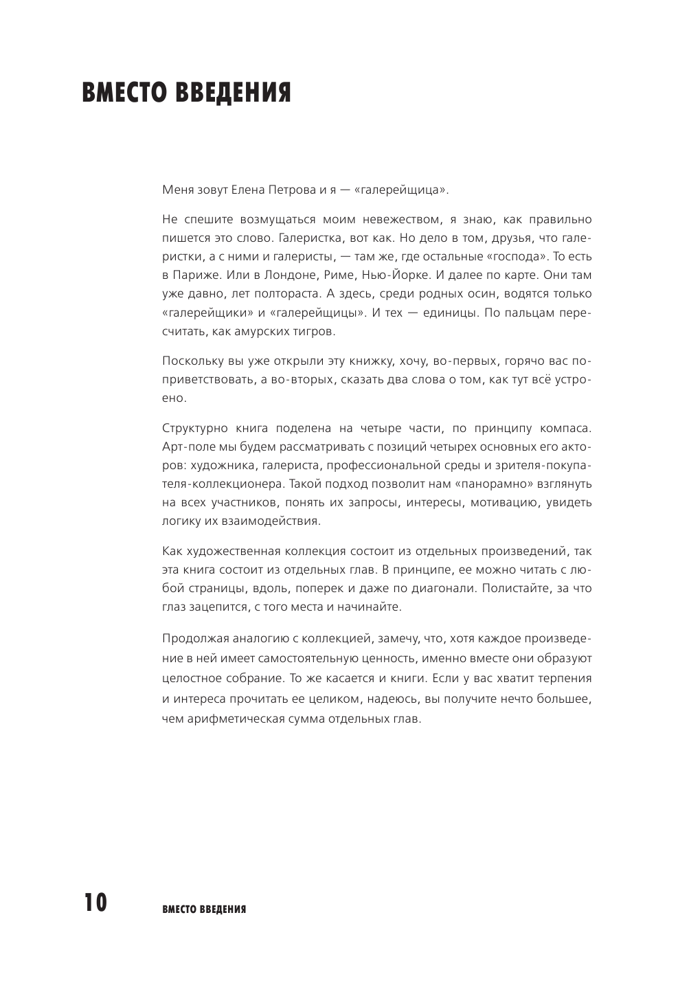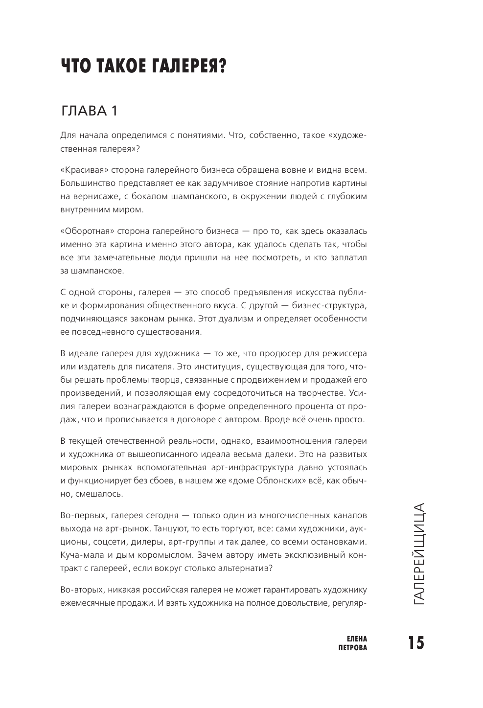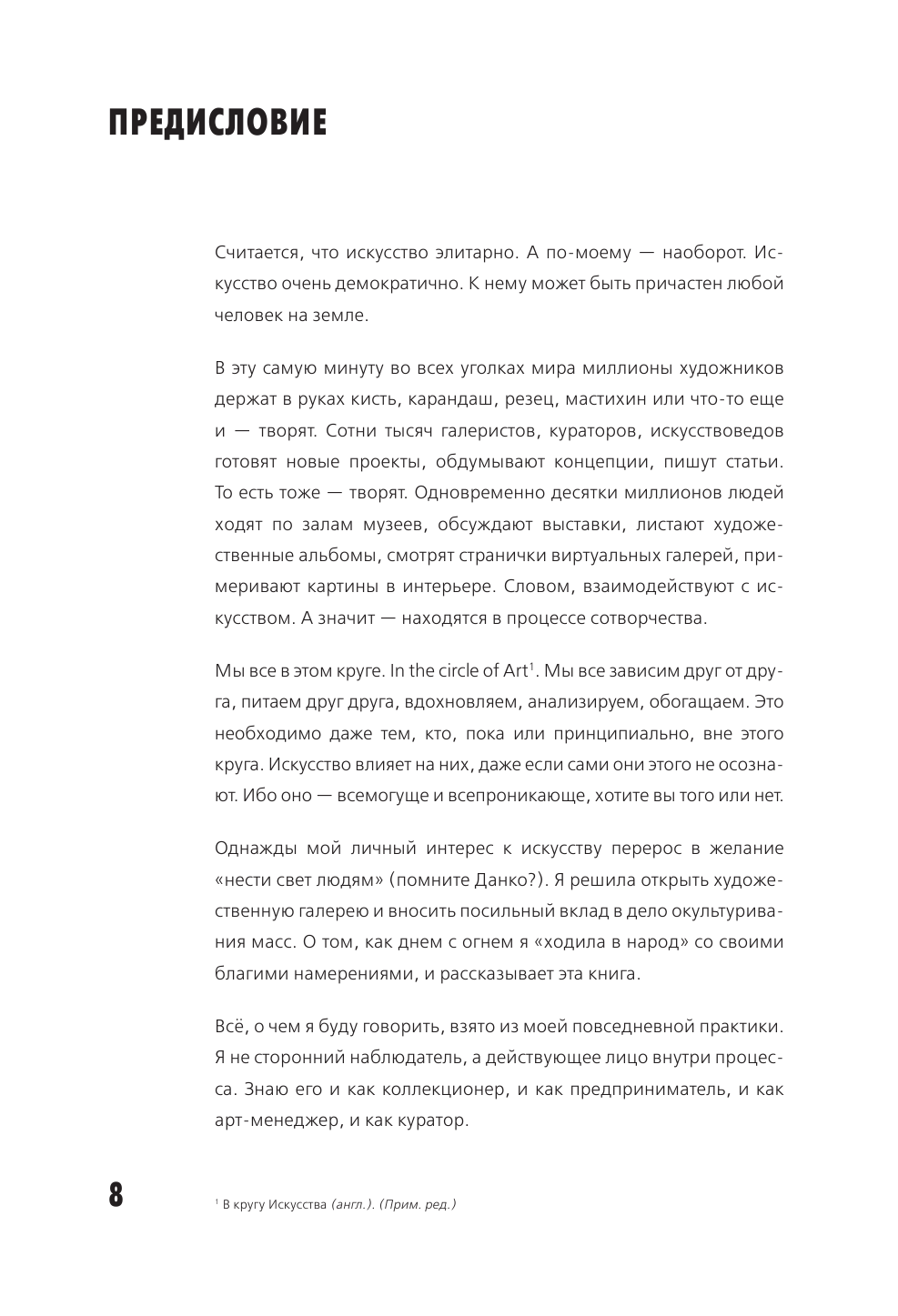 Весьма откровенный текст о желании найти себя в мире искусства. Поскольку страдаю тем же, сразу же приобрела книгу и нашла в ней много полезного для себя, как и подтверждение своей интуитивной правоты на выбранном пути. Много дельных советов, примеров, историй, наставлений и поучений. Приведена история открытия и функционирования отечественных галерей на современном отрезке жизни общества. Из негатива - крайне мелкий текст, неоправданно много иностранных фраз, чтобы мы догадались, что автор владеет также иностранными языками, видимо. Стиль книги довольно жесткий, но в целом было очень полезно ознакомиться, и в дальнейшем буду использовать в своей деятельности. Так что мой респект автору!