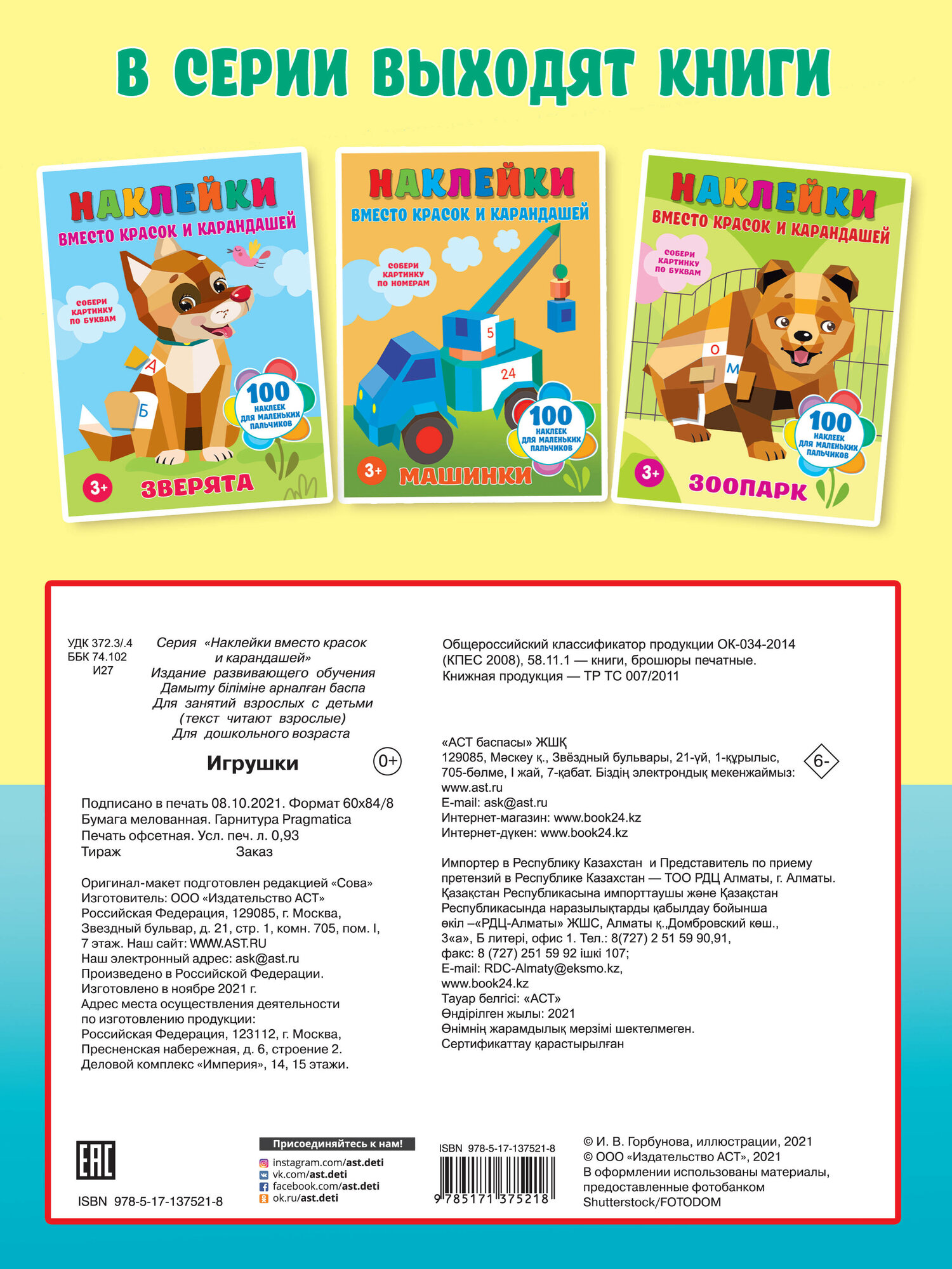 Книга: Игрушки (Наклейки вместо красок и карандашей); Сова. Малыш (Обучающая и развивающая литература), 2021