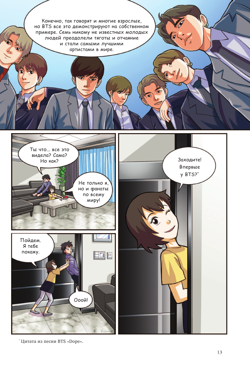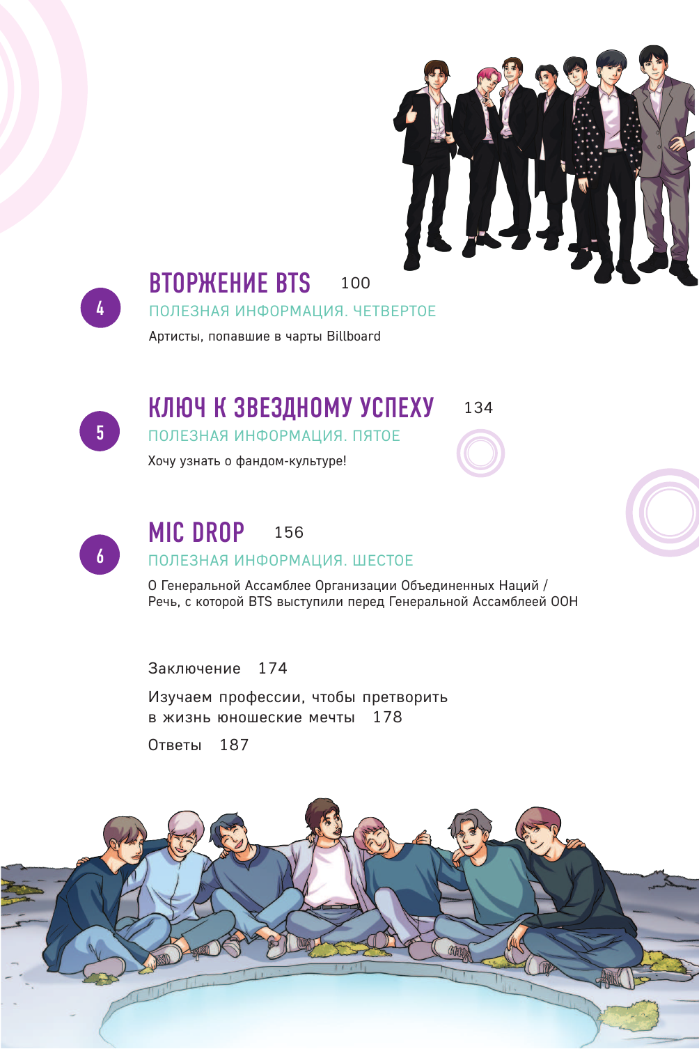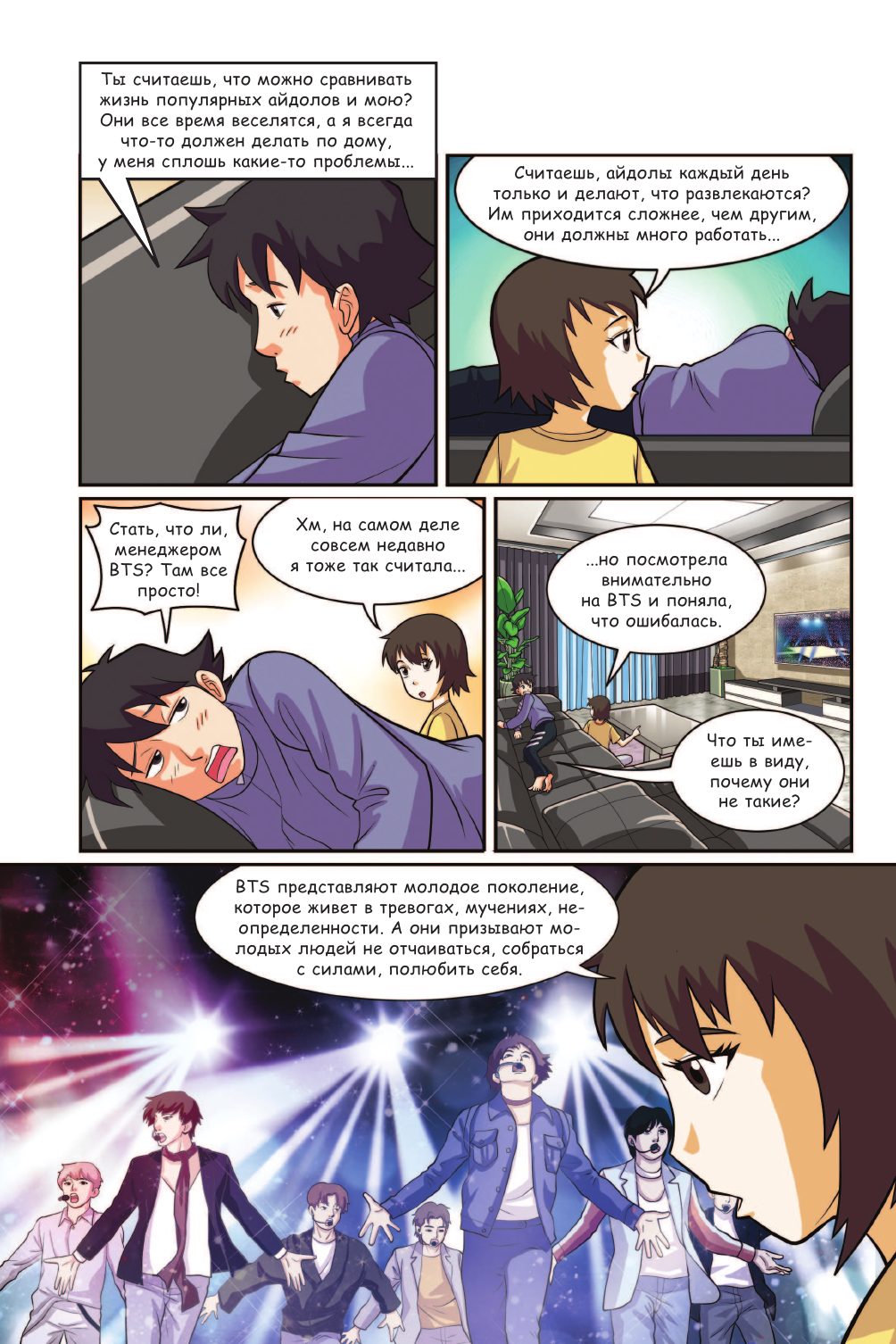 Это не первая книга про историю группы в моей коллекции. Решила, что подача информации в виде комикса должна быть интересно изложена. Автор очень хорошо постаралась. Я не нашла в книге каких-либо неточностей, что радует. С этим изданием можно приятно провести вечер, погрузившись в годы непростого творческого пути BTS. Фанаты, следящие за мальчиками давно, смогут обратиться к ярким воспоминаниям, связанным с исполнителями. А те, кто до этого не знали о существовании данной группы, обретут возможность в интересной форме познакомиться с ней, вступить в ряды ARMY (фанатов).
