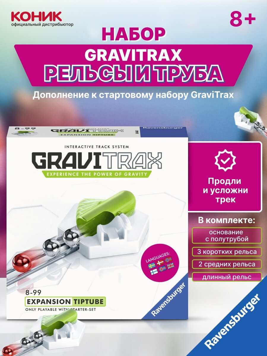 Дополнительный набор к конструктору Ravensburger GraviTrax «Рельсы и труба» с новыми строительными элементами расширит стартовый набор GraviTrax, позволив увеличить гоночный путь для шариков.
