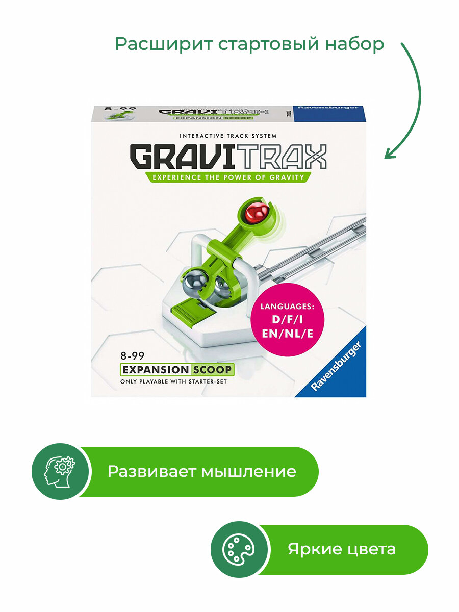 Дополнительный набор к конструктору Ravensburger GraviTrax «Ковш» с рельсами, перекидным ковшом и другими строительными элементами расширит стартовый набор GraviTrax, позволив увеличить гоночный путь для шариков.