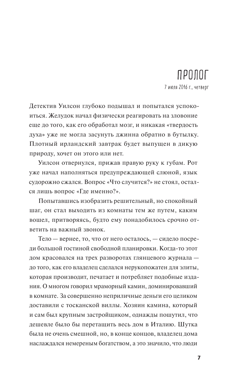 А каковы недостатки? На первых страницах описано обнаружение полицией трупа в ужасном состоянии (пытали), и описано это через реакцию одного из следователей: он повредил новые лабутены своей начальницы.