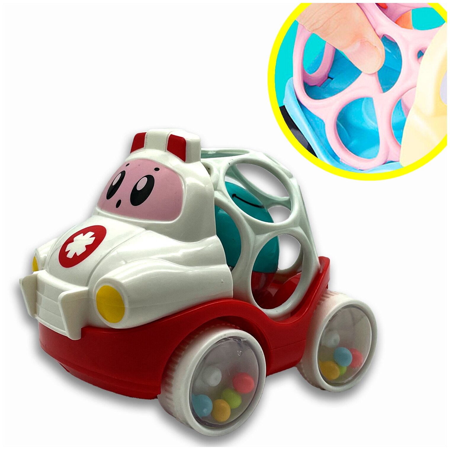 Милая детская погремушка в виде машинки скорой помощи из серии BABY YOU от Bondibon поможет задорно и весело провести время, а также будет способствовать развитию мелкой моторики, воображения и глазомера.