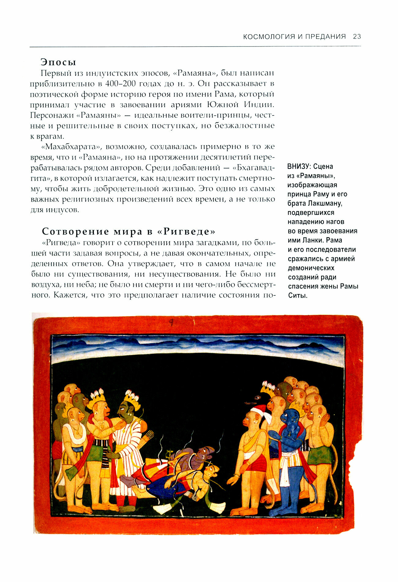 Узнайте о подразделяемой на четыре циклические юги, или эры, ведической космологии, в которой нет ни начала, ни конца; о креационном мифе о Варахе, могучем вепре, спасшем землю от гибели в древних водах. Познакомьтесь с легендой о Раме, который, несмотря на огромные трудности, вызволил свою любовь Ситу из плена у царя-демона Раваны; а также с Вишну, величайшим богом в Тримурти — индуистской триаде богов, с его девятью разными аватарами; Вишну предотвращает уничтожение земли, сохраняя атман, неизменную истинную сущность.