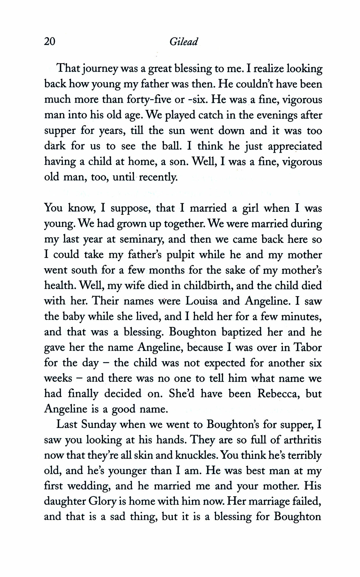 In 1956, toward the end of Reverend John Ames's life, he begins a letter to his young son, a kind of last testament to his remarkable forebears. Ames is troubled too by his prodigal namesake, Jack Boughton, his best friend's ne'er-do-well son, who seems to be a living contradiction of everything that Ames stands for.
