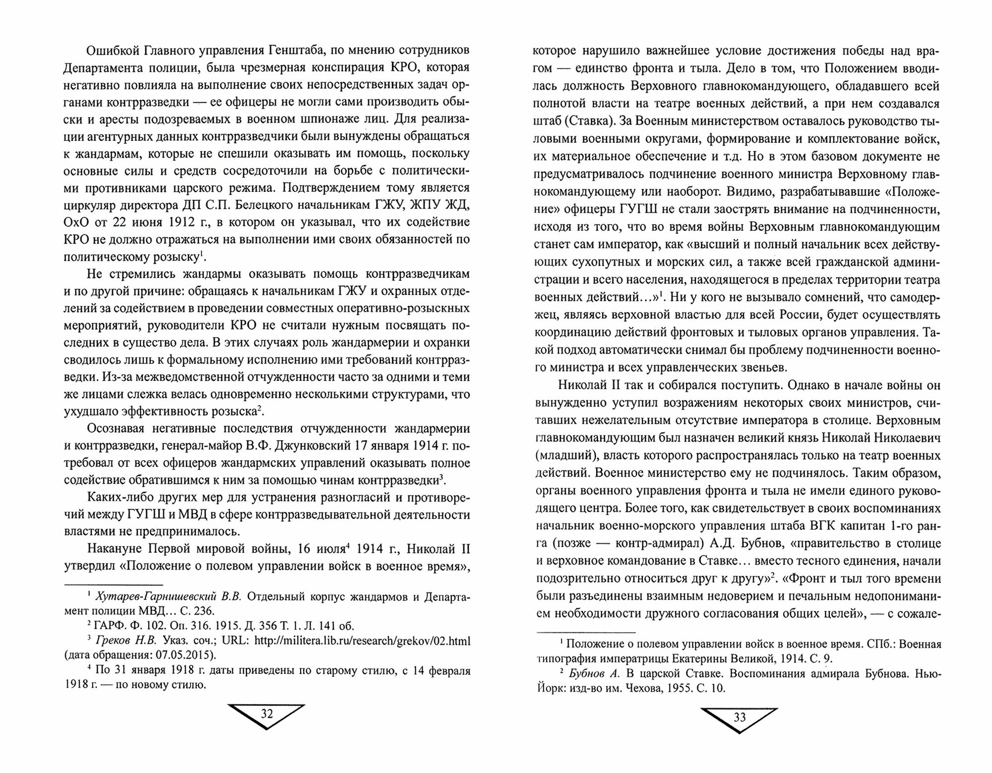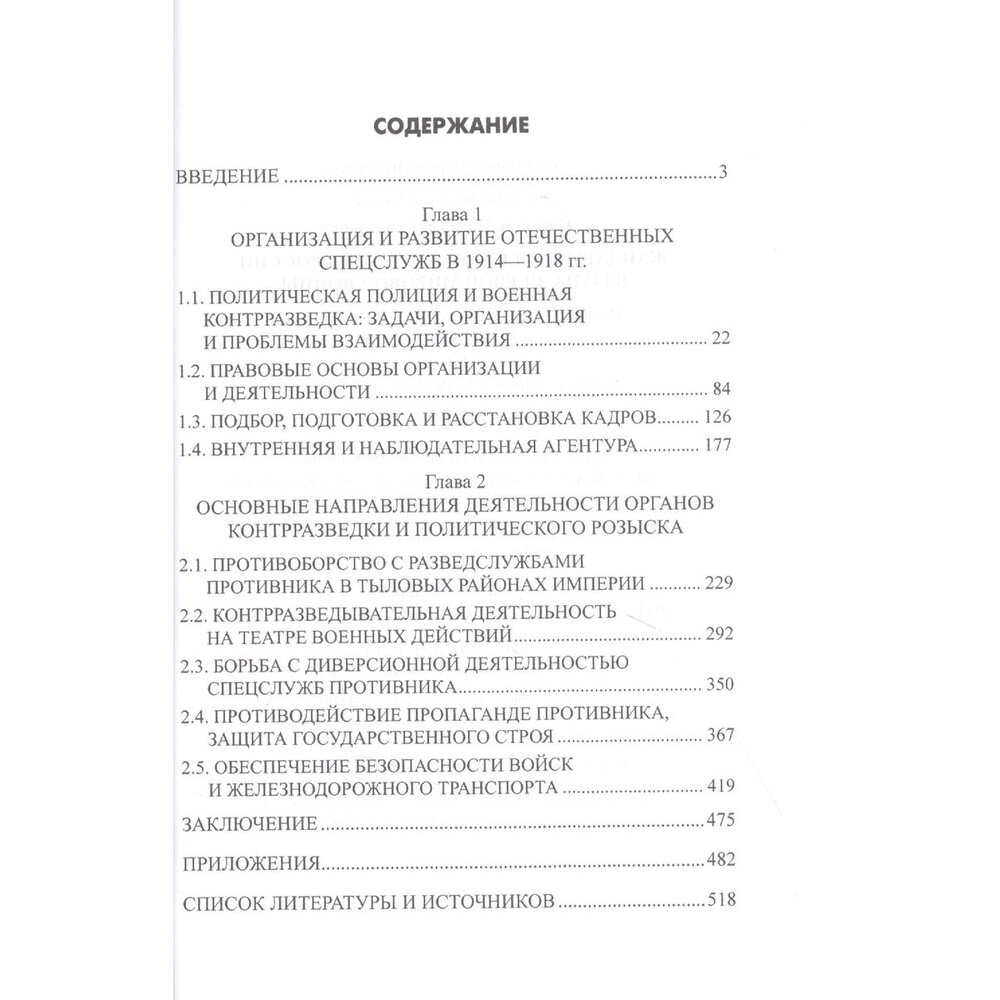 В книге рассматриваются вопросы организации и функционирования органов политического розыска и военной контрразведки России в годы Первой мировой войны. Автор подробно описывает структуру, правовые основы, силы и средства ведомств, их борьбу со шпионажем, государственными преступлениями, революционным движением и оппозиционными партиями, дезертирством, сепаратизмом, информационно-аналитическую работу. Значительное внимание уделяется деятельности политической полиции в январе - феврале 1917 г.