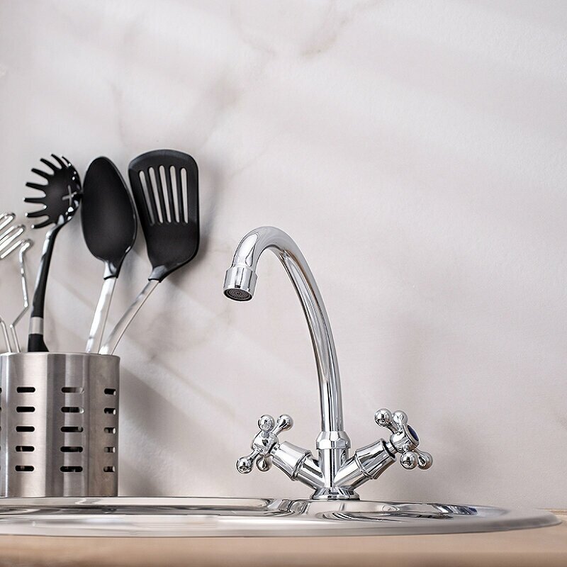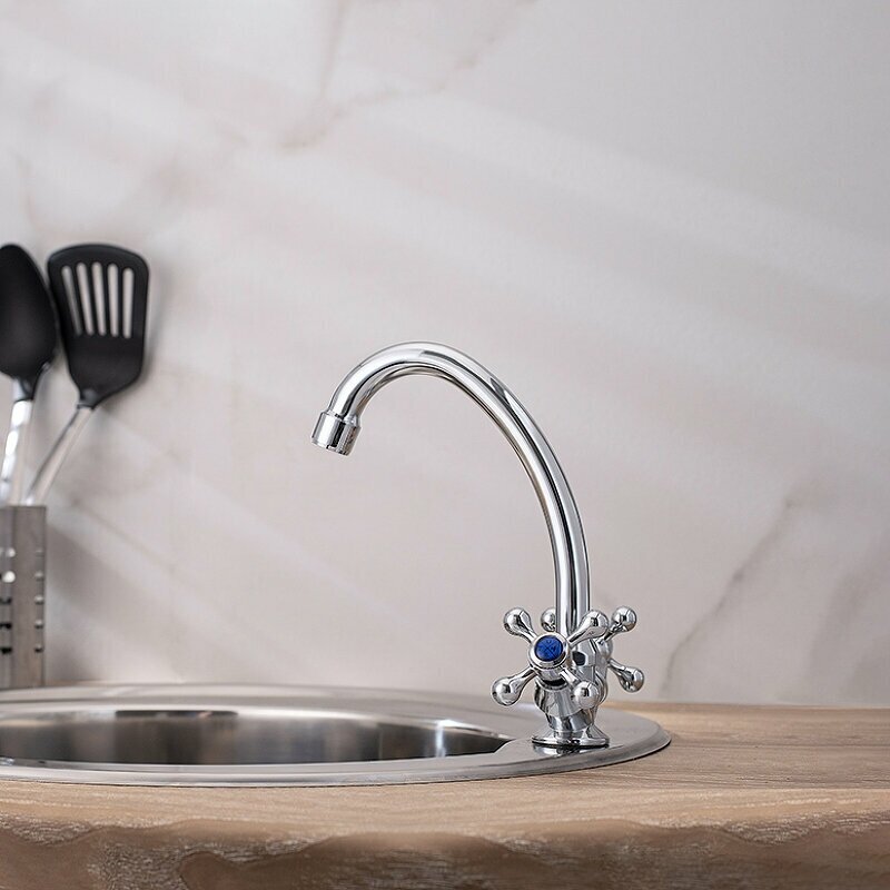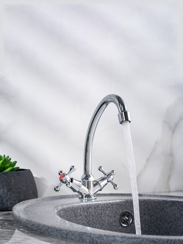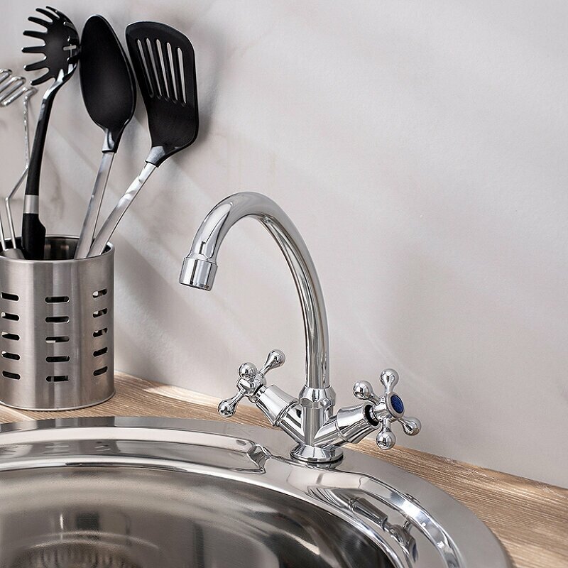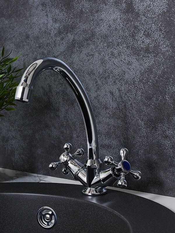 Двухвентильный смеситель для кухни с высоким поворотным изливом - это выбор удобства и стиля, которые гармонично сочетаются в данной модели.