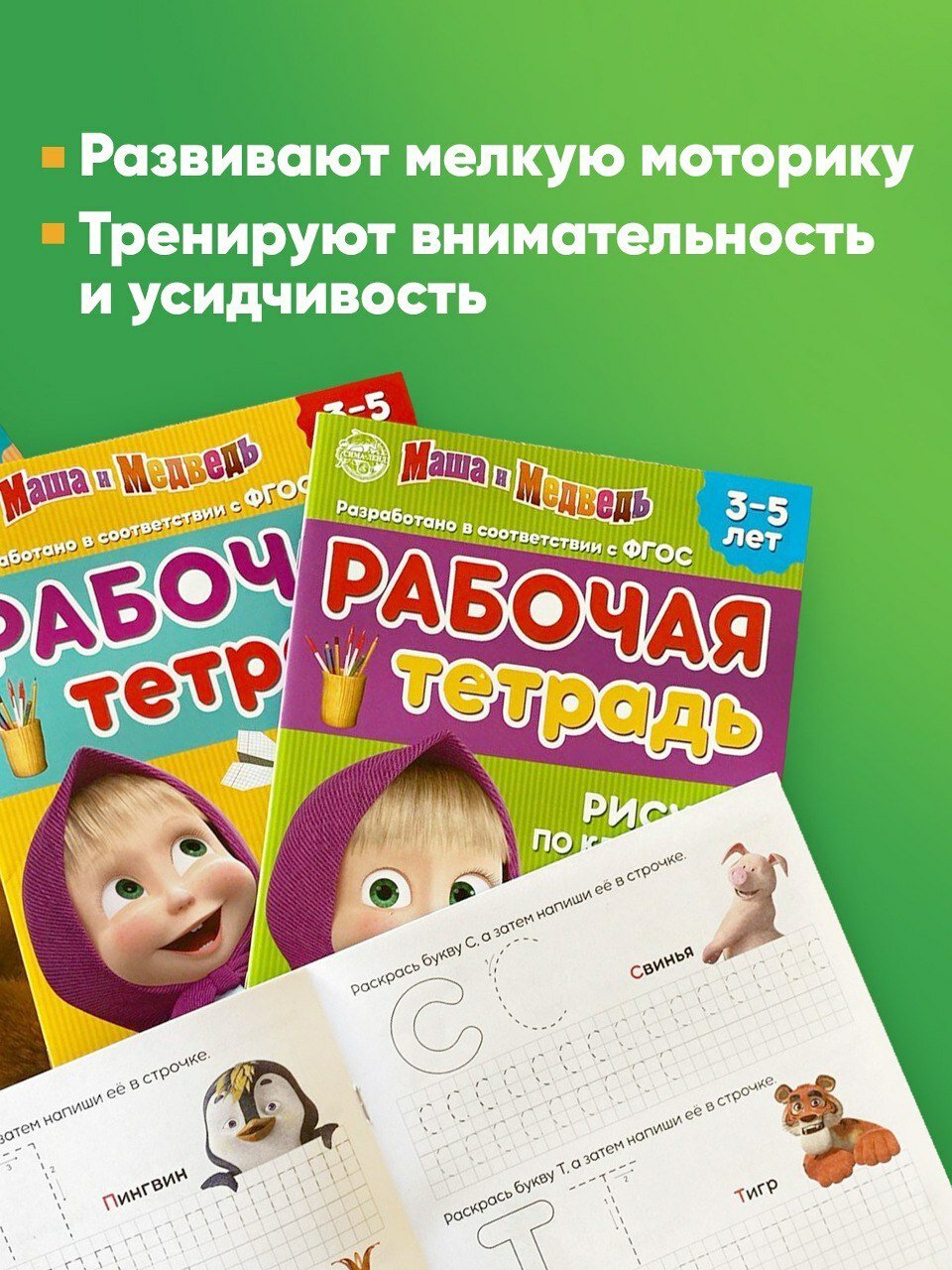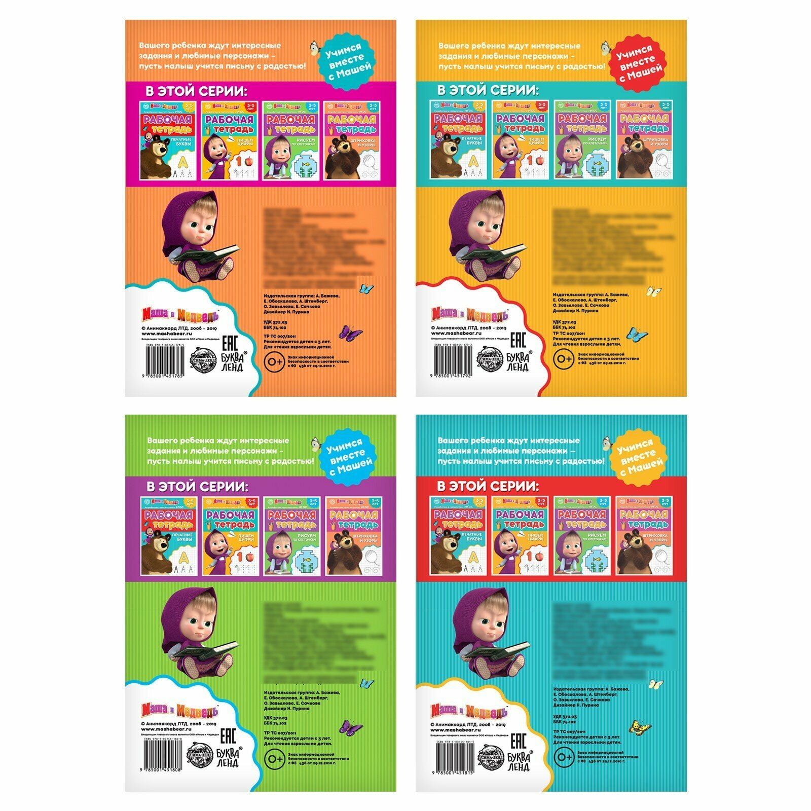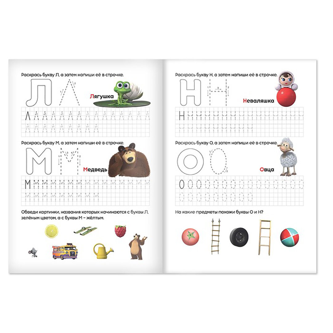 Внутри книг вы найдёте интересные задания, которые помогут ребёнку в игровой форме освоить алфавит, цифры, счёт до 10, запомнить цвета, узнать времена года и научиться определять время. Также в книгах есть забавные иллюстрации с любимыми героями мультфильма "Маша и Медведь".