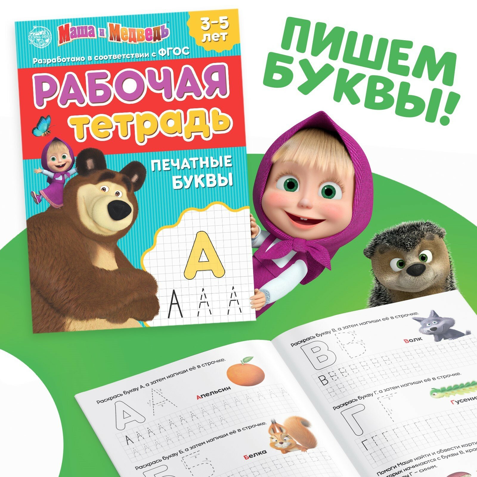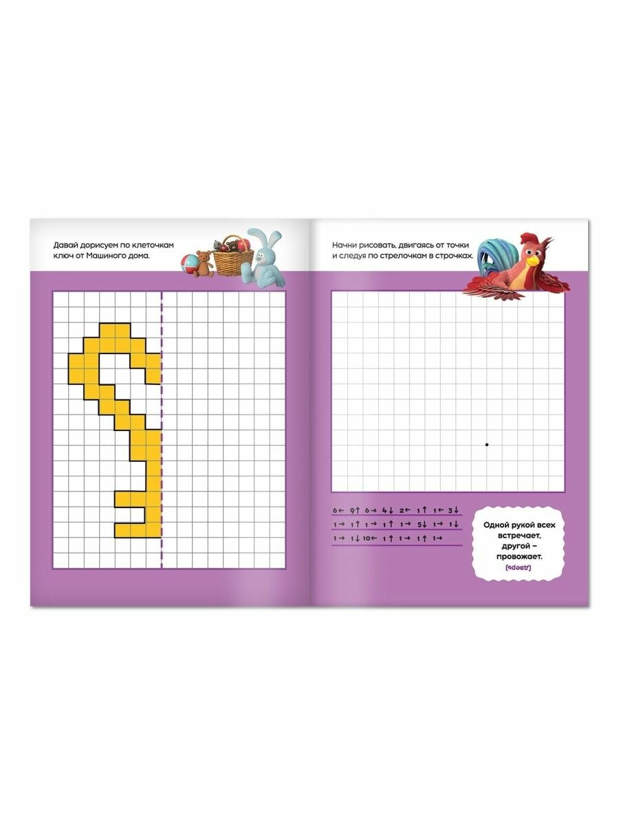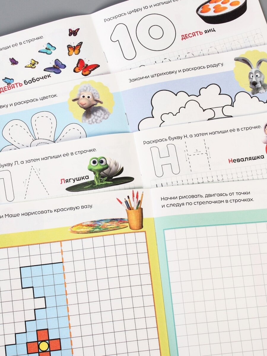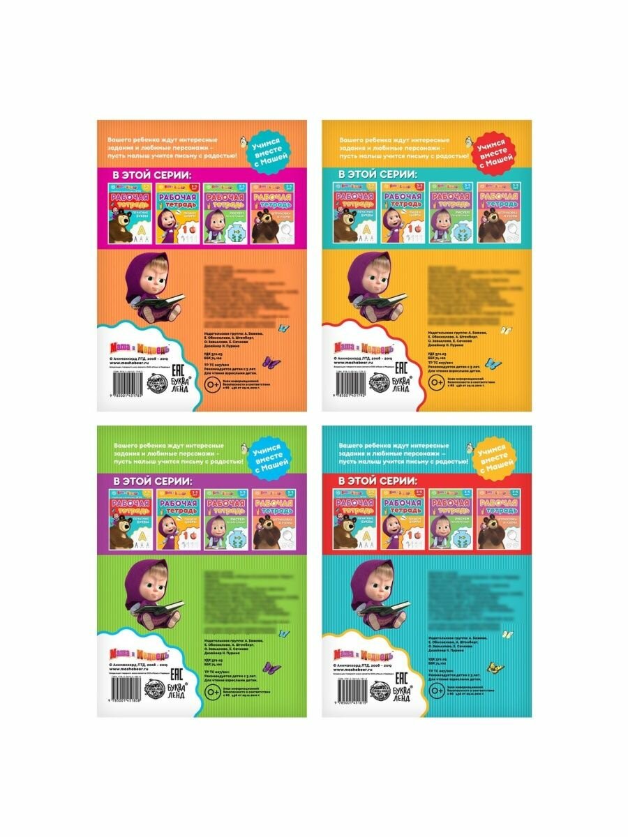Внутри книг вы найдёте интересные задания, которые помогут ребёнку в игровой форме освоить алфавит, цифры, счёт до 10, запомнить цвета, узнать времена года и научиться определять время. Также в книгах есть забавные иллюстрации с любимыми героями мультфильма "Маша и Медведь".