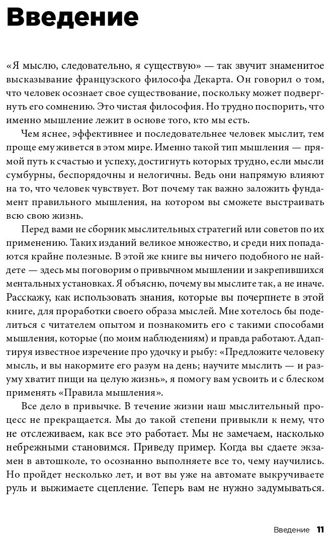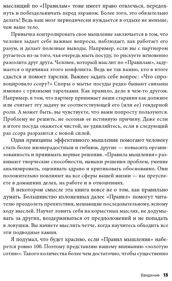Мы завидуем здравомыслящим людям, которые умеют без колебаний найти выход из трудной ситуации, восхищаемся теми, кто умеет понять точку зрения других, кого слушают и к кому обращаются за советом. Но врожденный ли это дар, или мышлению можно научиться? Наблюдая за привычками и практиками успешных и счастливых людей, Ричард Темплар составил 100 универсальных правил мышления, которые можно применять в повседневной жизни на пользу себе и окружающим. Автор рассказывает, какие ментальные ошибки день за днем совершают люди, и дает советы желающим избежать этих ошибок и понять, как работает наше мышление. Из этой книги вы узнаете, как сохранять самообладание и отстаивать свое мнение, не додумывать за других и избегать интеллектуальных ловушек, научитесь принимать более взвешенные решения, будете точно знать, когда стоит идти на компромисс, и научитесь ясно мыслить, даже когда вас будут пытаться сбить с толку.
