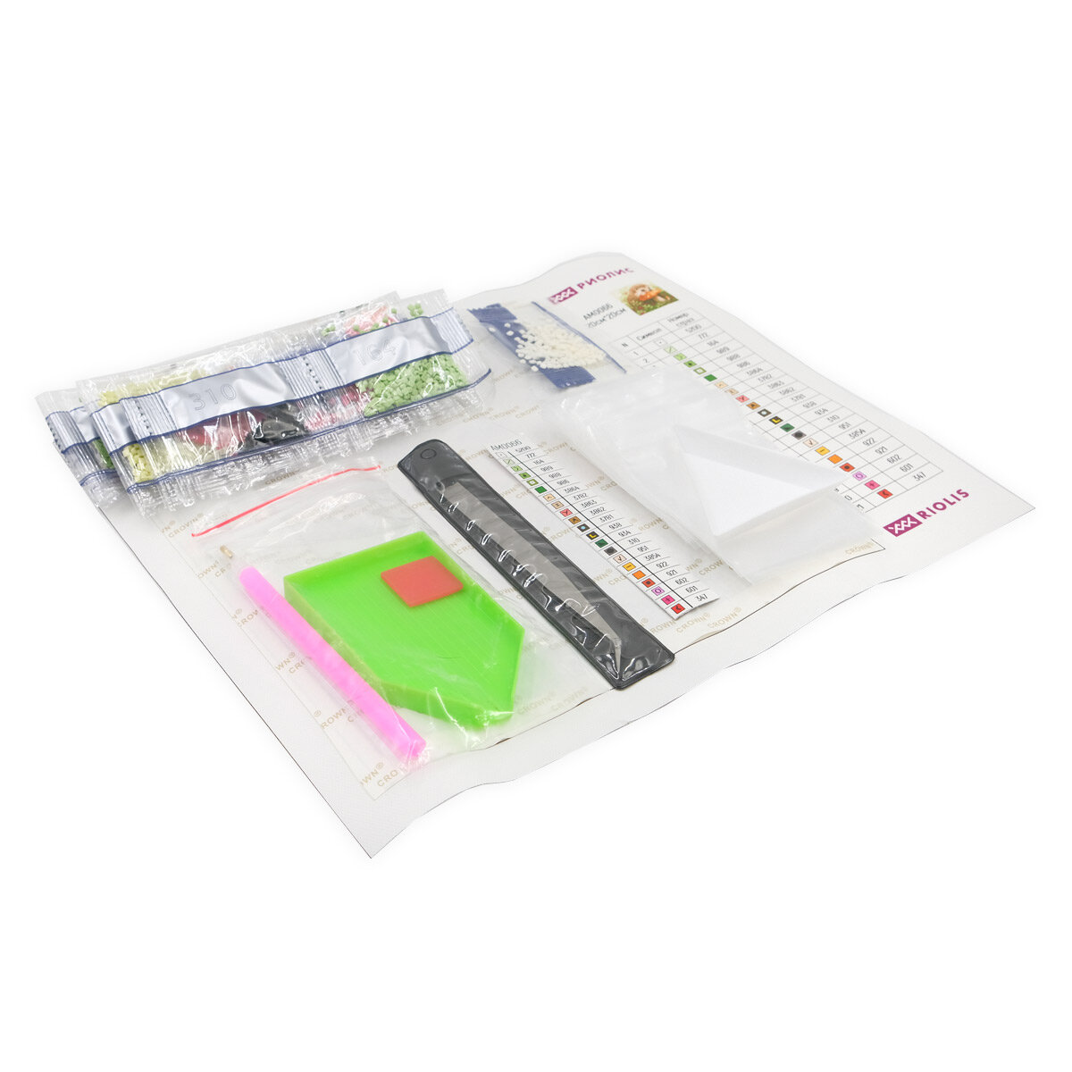 | Комплектация | Холст с клеевым слоем и условными обозначениями (схема), акриловые квадратные стразы, стилус (карандаш), пинцет, контейнер для страз, воск, инструкция. |