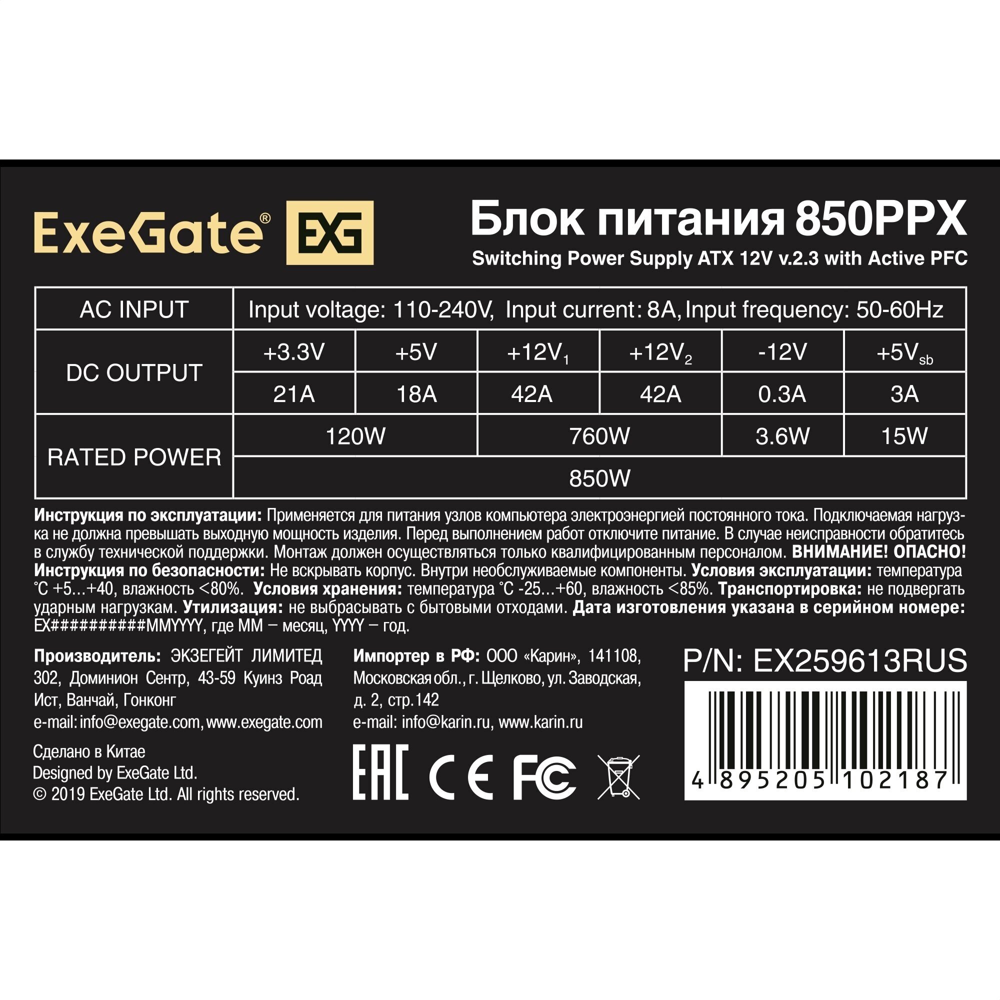 Блок питания ATX Exegate EX259613RUS-S 850W RTL SC black APFC 14cm 24p+2*(4+4)p PCI-E 4*IDE 5*SATA FDD + кабель 220V с защитой от выде 850PPX