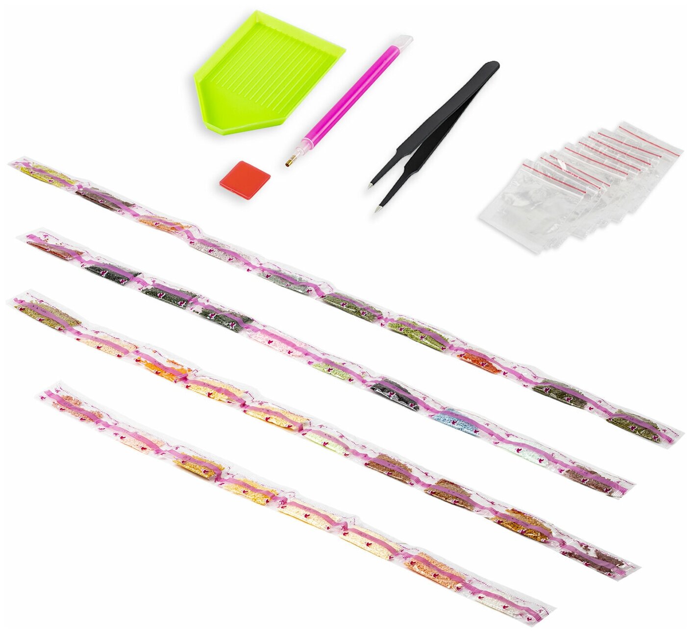 | Комплектация | - свёрнутый холст размером 46х56 см; - набор квадратных страз разных цветов, пронумерованных в соответствии со схемой; - набор удобных закрывающихся пакетиков; - металлический пинцет; - пластиковый карандаш-стилус для захвата страз; - клеевая подушечка; - пластиковый контейнер; - схема соответствия цветов страз и символов на холсте. |