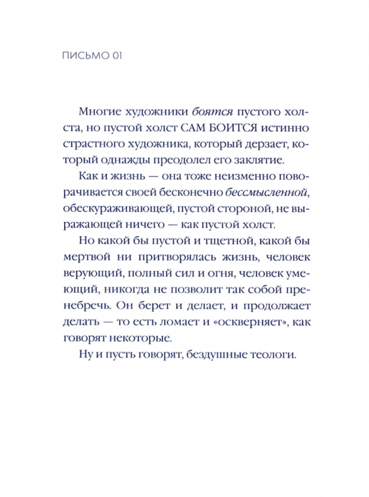 Интересный формат книги - изложение мыслей великих творцов в письмах. Читается очень легко и непринуждённо. Настоящий отдых для головы. Но при этом авторы писем рассказывают о глубоких переживаниях, с которыми сталкиваются в процессе творчества. Если вы как-то связаны с искусством, то эта книга будет как приятный разговор с другом, который понимает и разделяет ваши чувства и волнения.