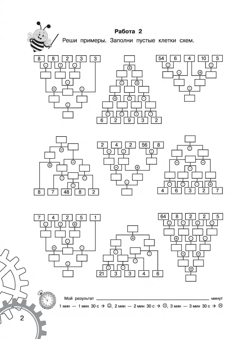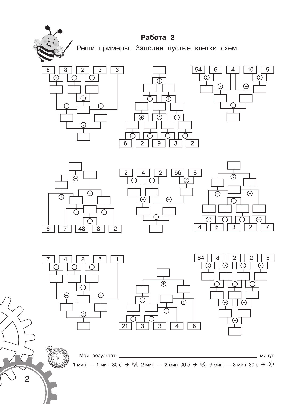 В конце каждой страницы предусмотрено место для записи времени, в течение которого ребёнок выполнил вычисления, а также указано время для оценки этого результата.