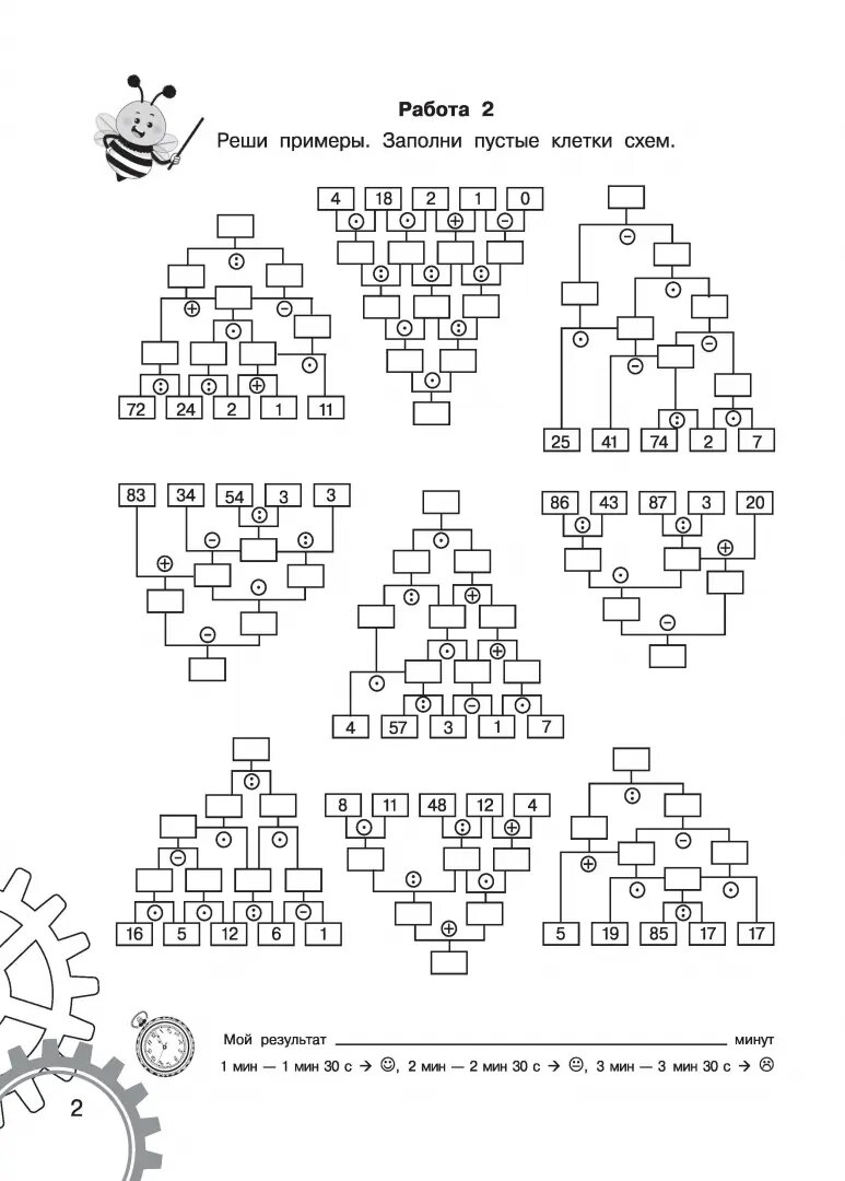 В конце каждой страницы предусмотрено место для записи времени, в течение которого ребёнок выполнил вычисления, а также указано время для оценки этого результата.