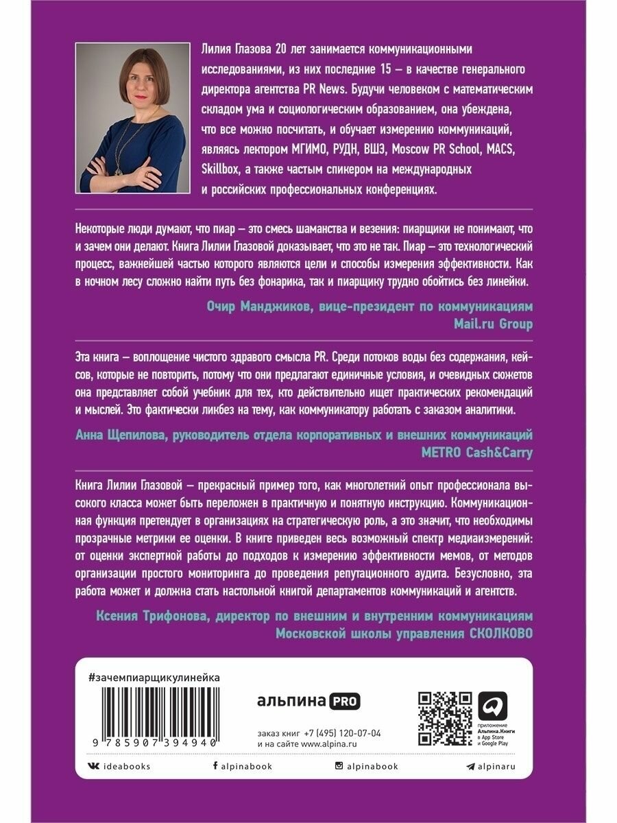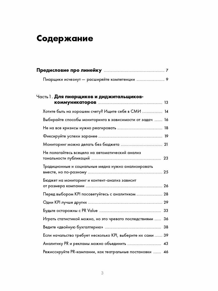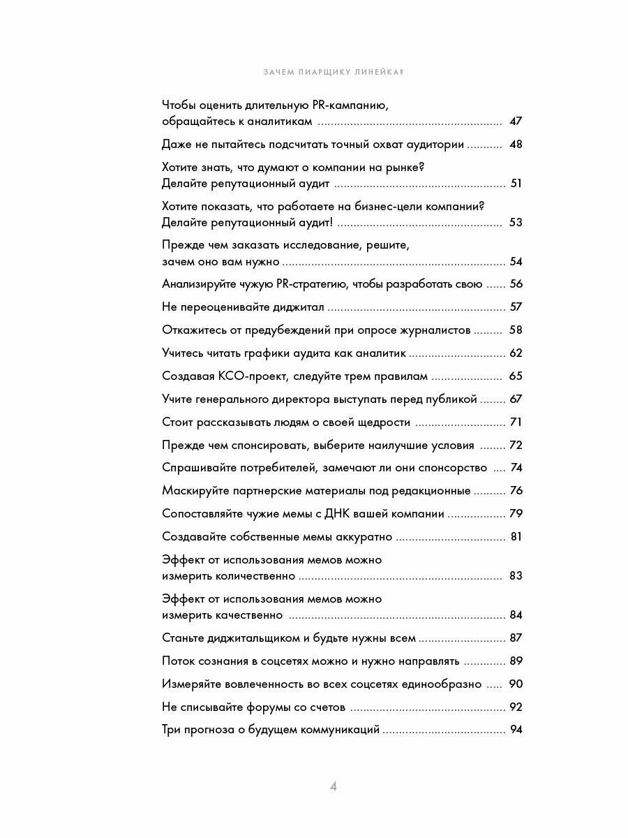 Будучи признанным экспертом в своей области, автор помогает читателям разобраться в том, какие исследования и когда проводить, как мониторить СМИ, выбирать подходящий KPI, анализировать эффективность коротких и длинных PR-кампаний и спонсорских проектов, как представлять результаты руководству.