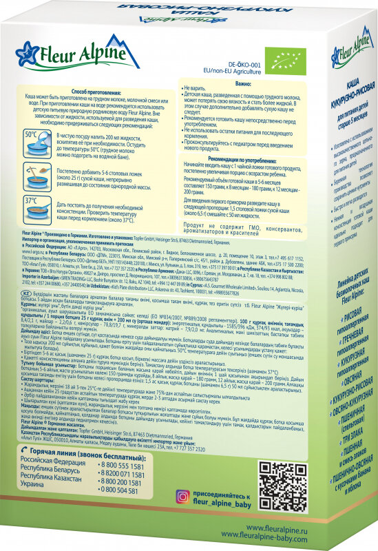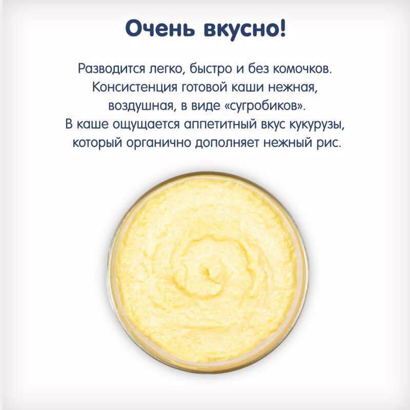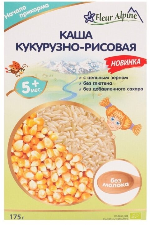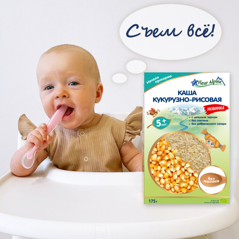 Кукурузно-рисовая каша Fleur Alpine подходит для начала прикорма. Разводится легко, быстро и без комочков. Нежная, воздушная консистенция готовой каши в виде «сугробиков» напоминает снег, который ложится на поверхность небольшими пышными неровностями. В каше ощущается аппетитный вкус кукурузы, который органично дополняет нежный рис. Каша из двух злаков обладает повышенной питательной ценностью по сравнению с монокомпонентной, поэтому особо подходит малышам с недобором веса.