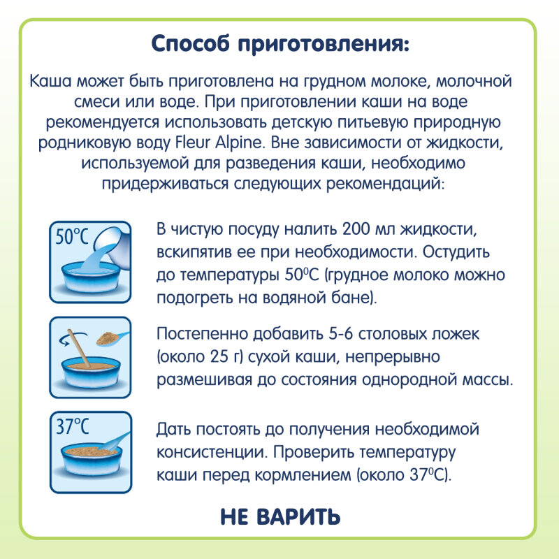 | Способ приготовления | В чистую посуду налить 200 мл жидкости, вскипятив ее при необходимости.Остудить ее до температуры 50°С (грудное молоко можно подогреть на водяной бане). Постепенно добавить 5-6 столовых ложек (около 25 г) сухой каши, непрерывно размешивая до состояния однородной массы. Дать постоять до получения необходимой консистенции. Проверить температуру каши перед кормлением (около 37°С). |
