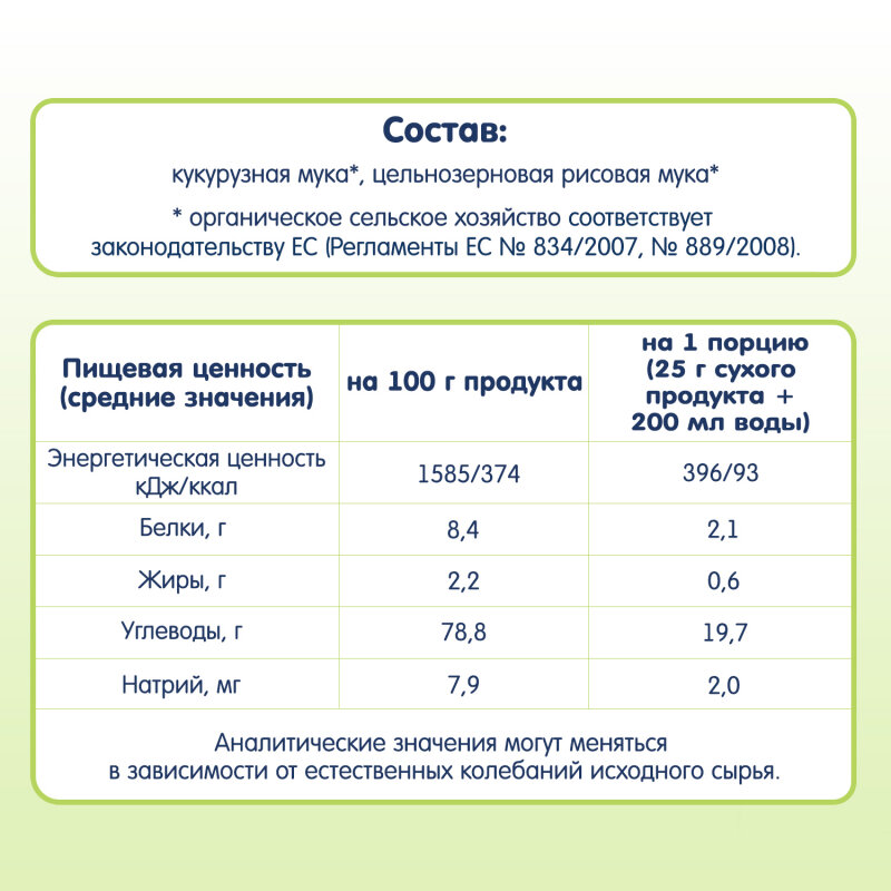 | Состав | кукурузная мука; цельнозерновая рисовая мука |