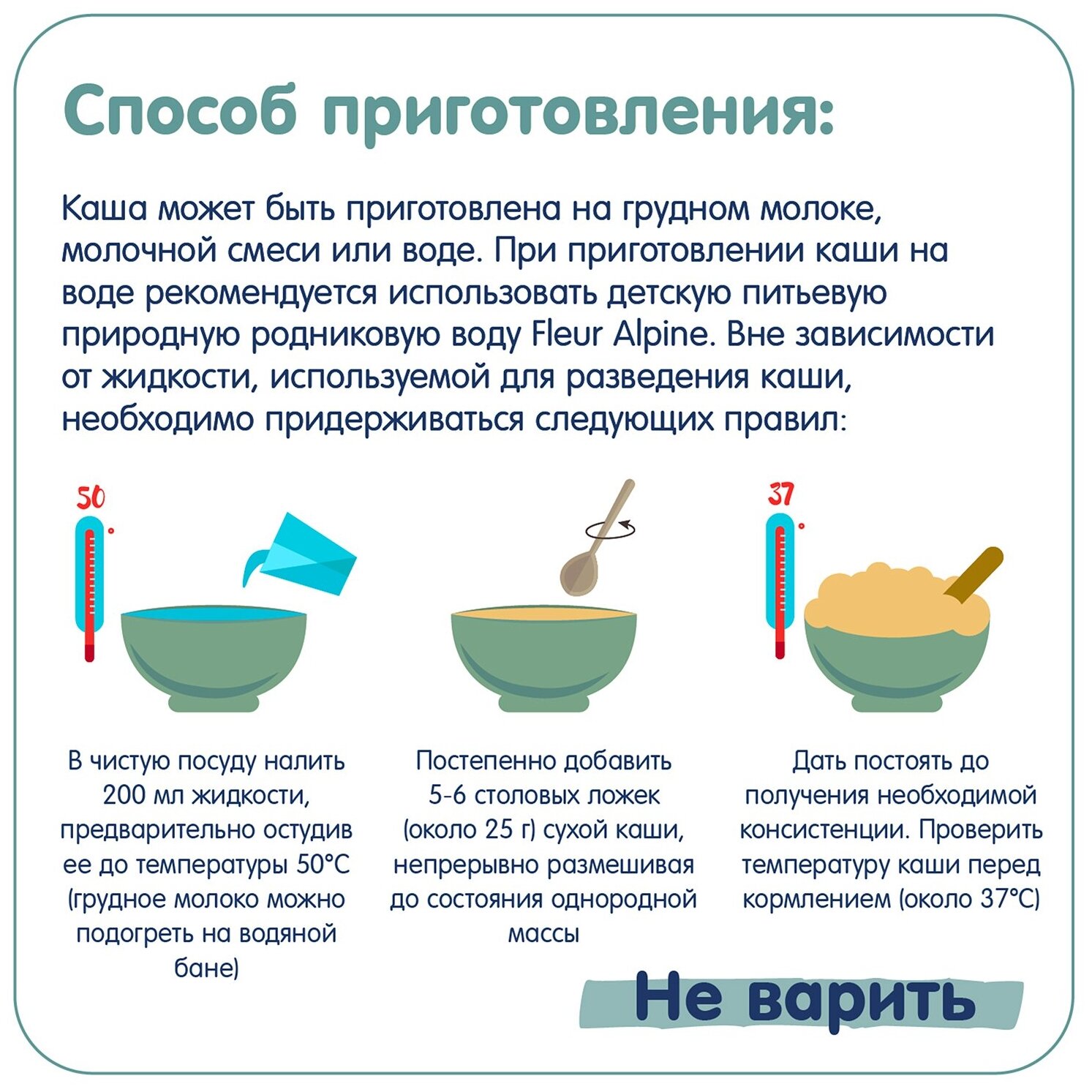 | Способ приготовления | В чистую посуду налить 200 мл жидкости, вскипятив ее при необходимости.Остудить ее до температуры 50°С (грудное молоко можно подогреть на водяной бане). Постепенно добавить 5-6 столовых ложек (около 25 г) сухой каши, непрерывно размешивая до состояния однородной массы. Дать постоять до получения необходимой консистенции. Проверить температуру каши перед кормлением (около 37°С). |