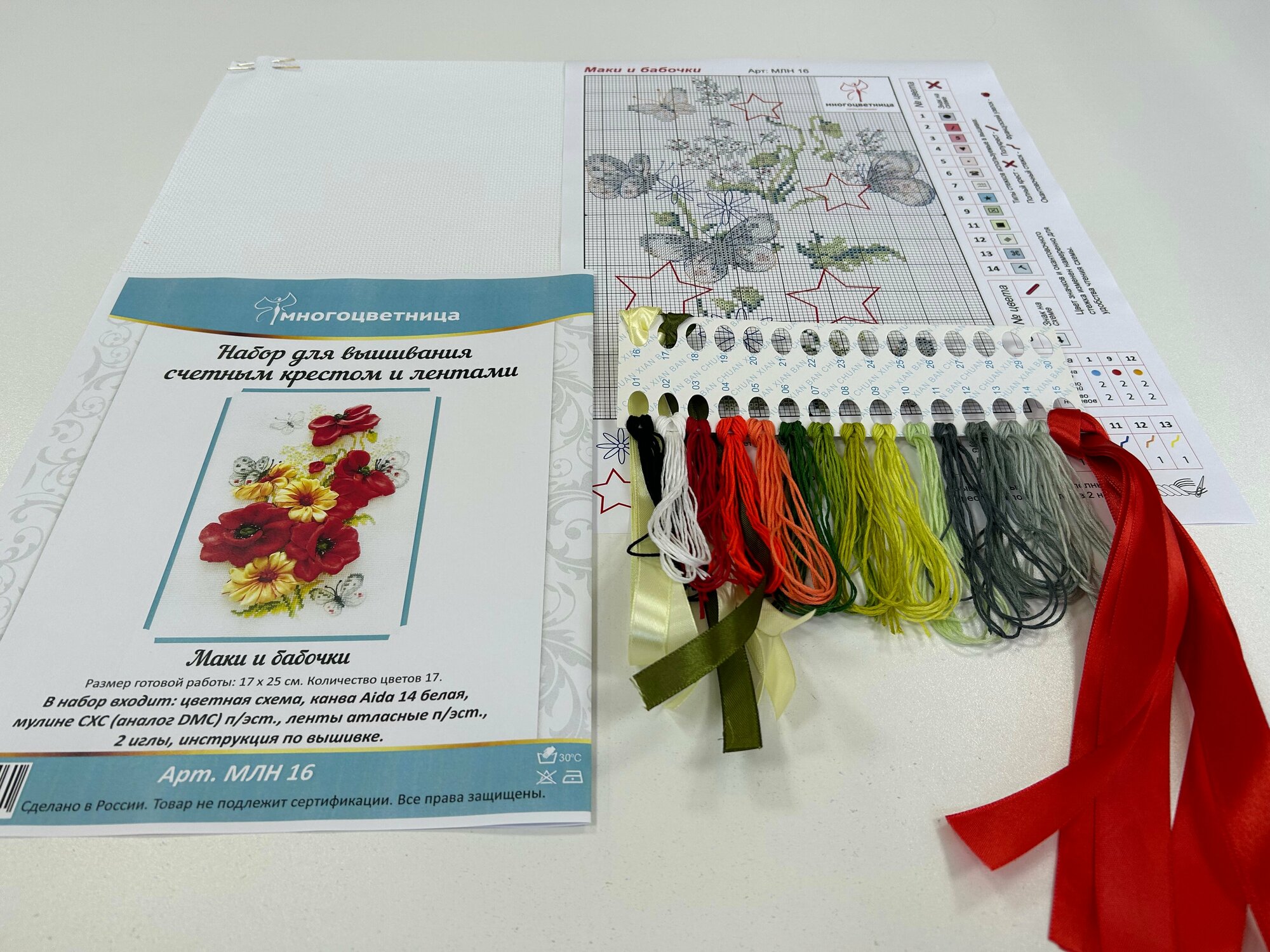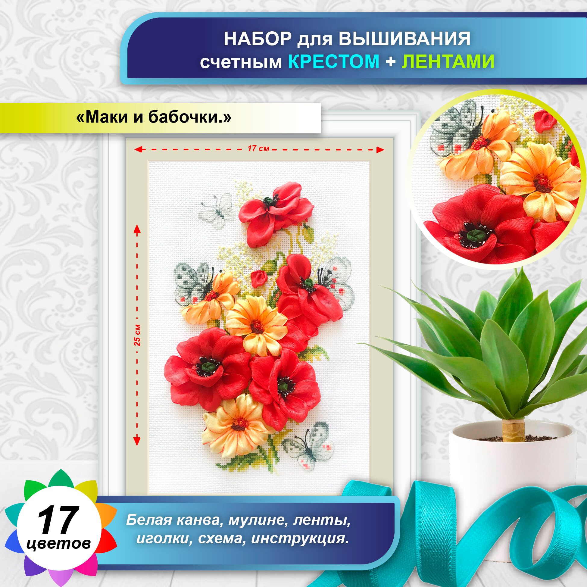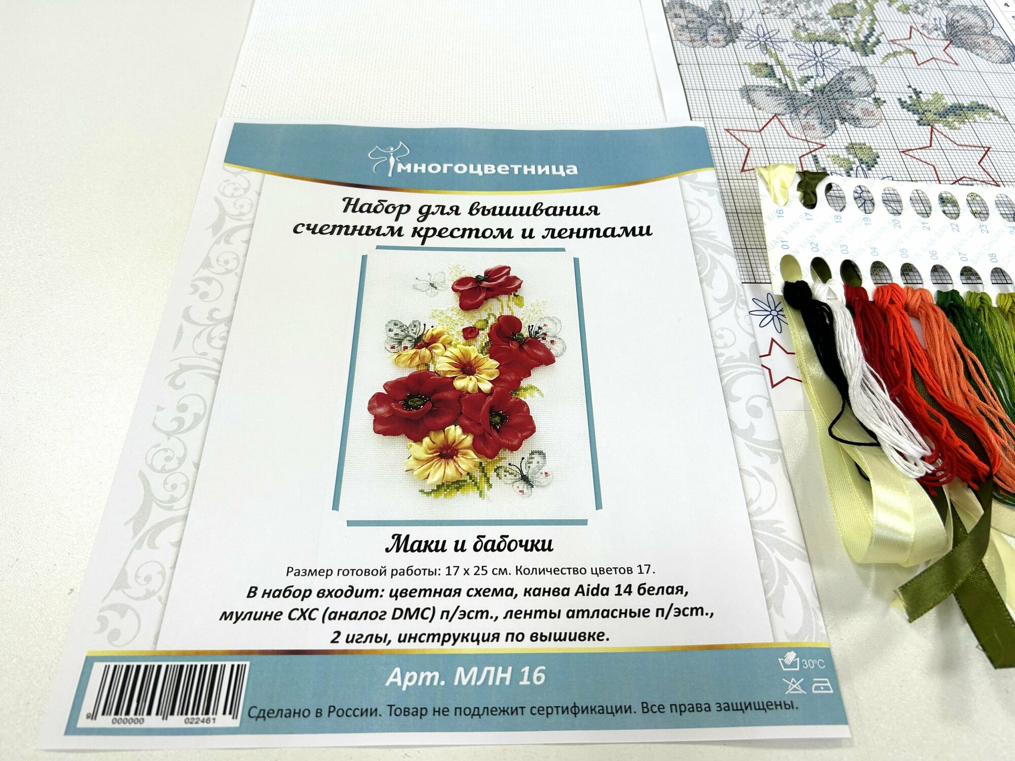Набор для вышивания "Маки и бабочки" - это готовый набор материалов, с помощью которого можно создать свой шедевр в одной из техник. Вышивание крестом является кропотливым видом рукоделия и подходит как для новичков, так и для опытных мастериц. Готовое произведение станет отличным украшением интерьера или подарком для близкого человека. В набор входят - Канва 14 Aida белого цвета; - Ленты атласные разныx размеров 100% полиэстер; - Нитки мулине xлопок: 17 цв; - Игла - 2 шт; - Цветная сxема; - Инструкция по вышиванию