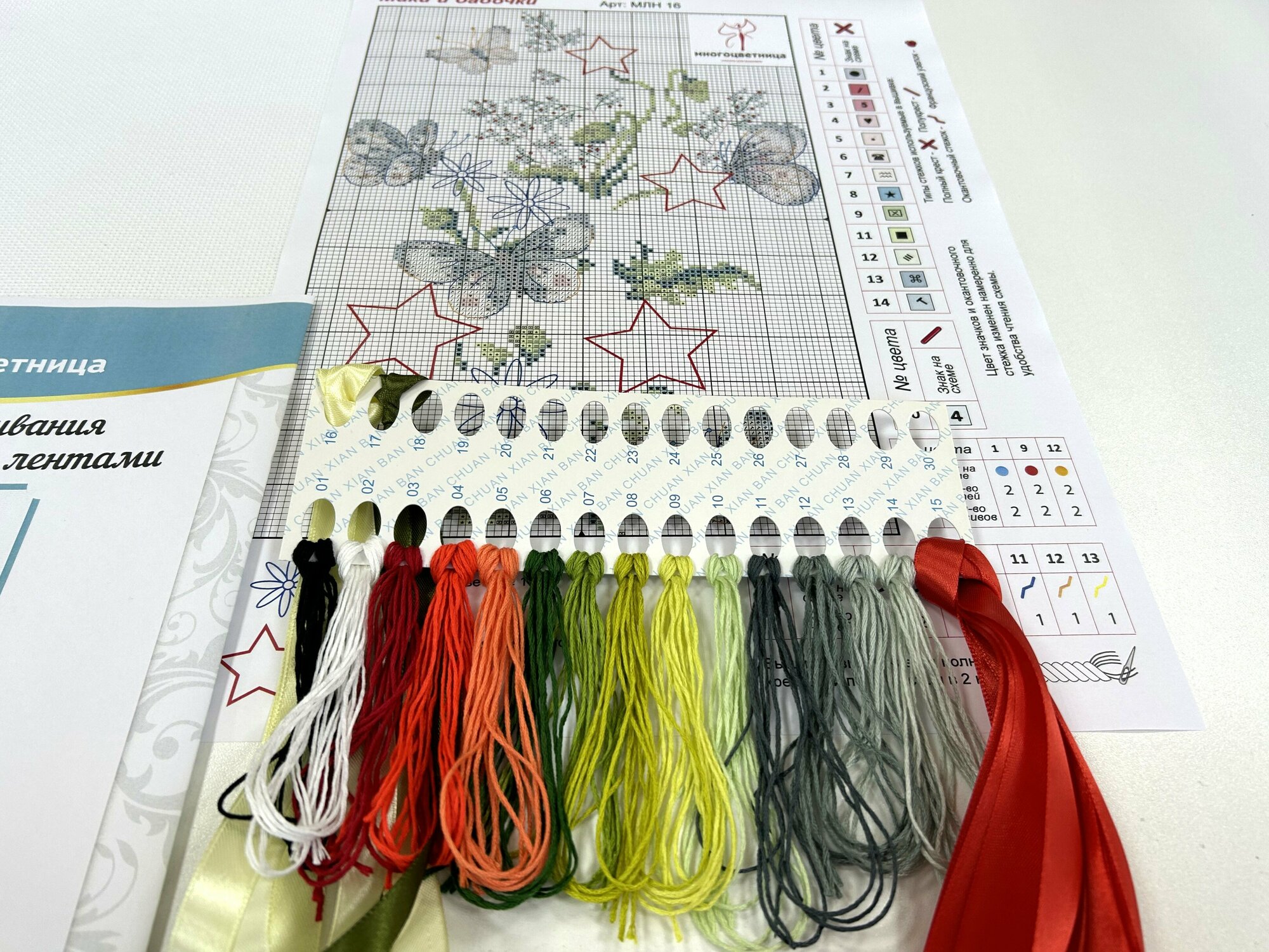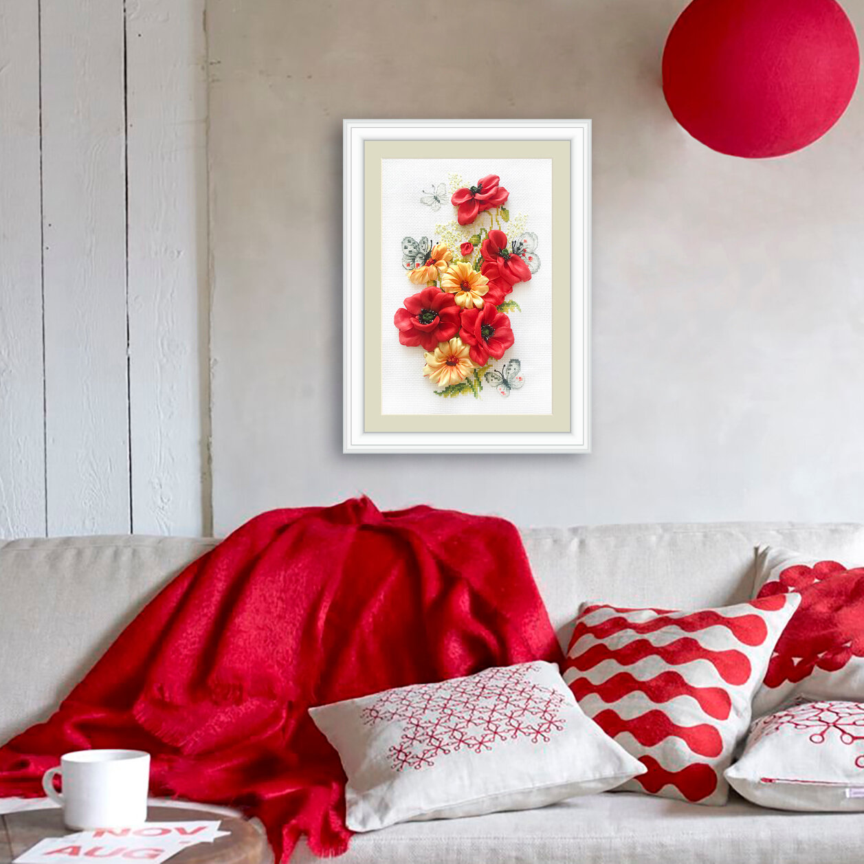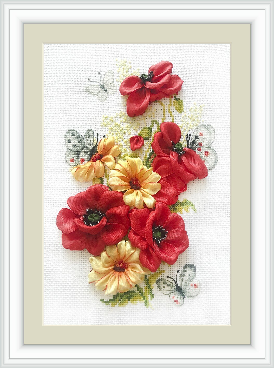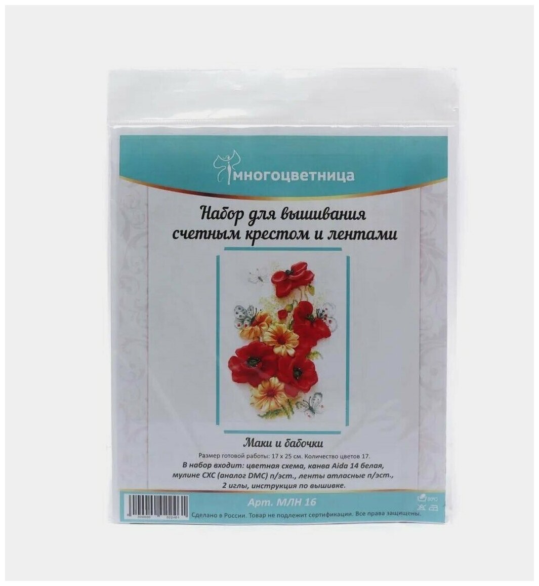 Набор для вышивания "Маки и бабочки" - это готовый набор материалов, с помощью которого можно создать свой шедевр в одной из техник. Вышивание крестом является кропотливым видом рукоделия и подходит как для новичков, так и для опытных мастериц. Готовое произведение станет отличным украшением интерьера или подарком для близкого человека. В набор входят - Канва 14 Aida белого цвета; - Ленты атласные разныx размеров 100% полиэстер; - Нитки мулине xлопок: 17 цв; - Игла - 2 шт; - Цветная сxема; - Инструкция по вышиванию