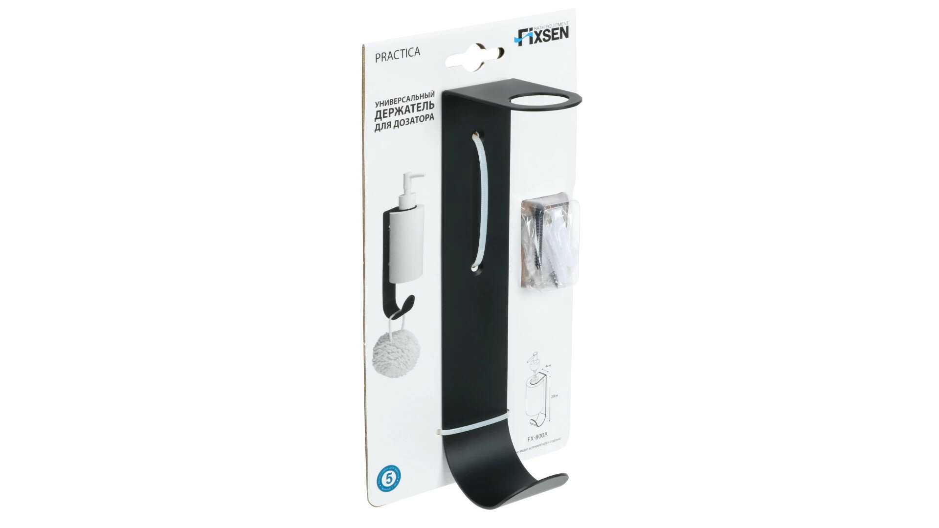 **Держатель Fixsen Practica** крепится к стене. Позволяет освободить пространство на раковине или столешнице, зафиксировать дозатор с жидким мылом или чистящим средством на комфортной высоте. В нижней части располагается крючок, на который можно подвесить полотенце или мочалку.