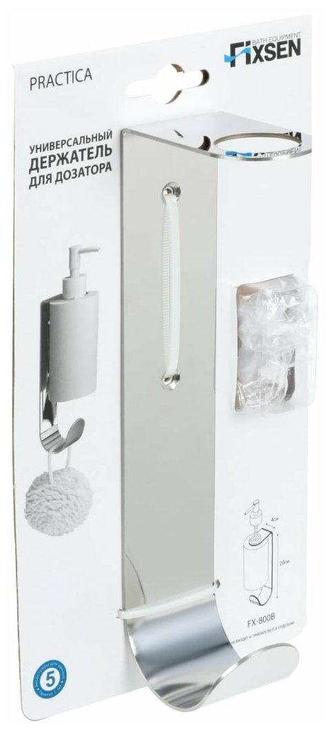 **Держатель Fixsen Practica** крепится к стене. Позволяет освободить пространство на раковине или столешнице, зафиксировать дозатор с жидким мылом или чистящим средством на комфортной высоте. В нижней части располагается крючок, на который можно подвесить полотенце или мочалку.