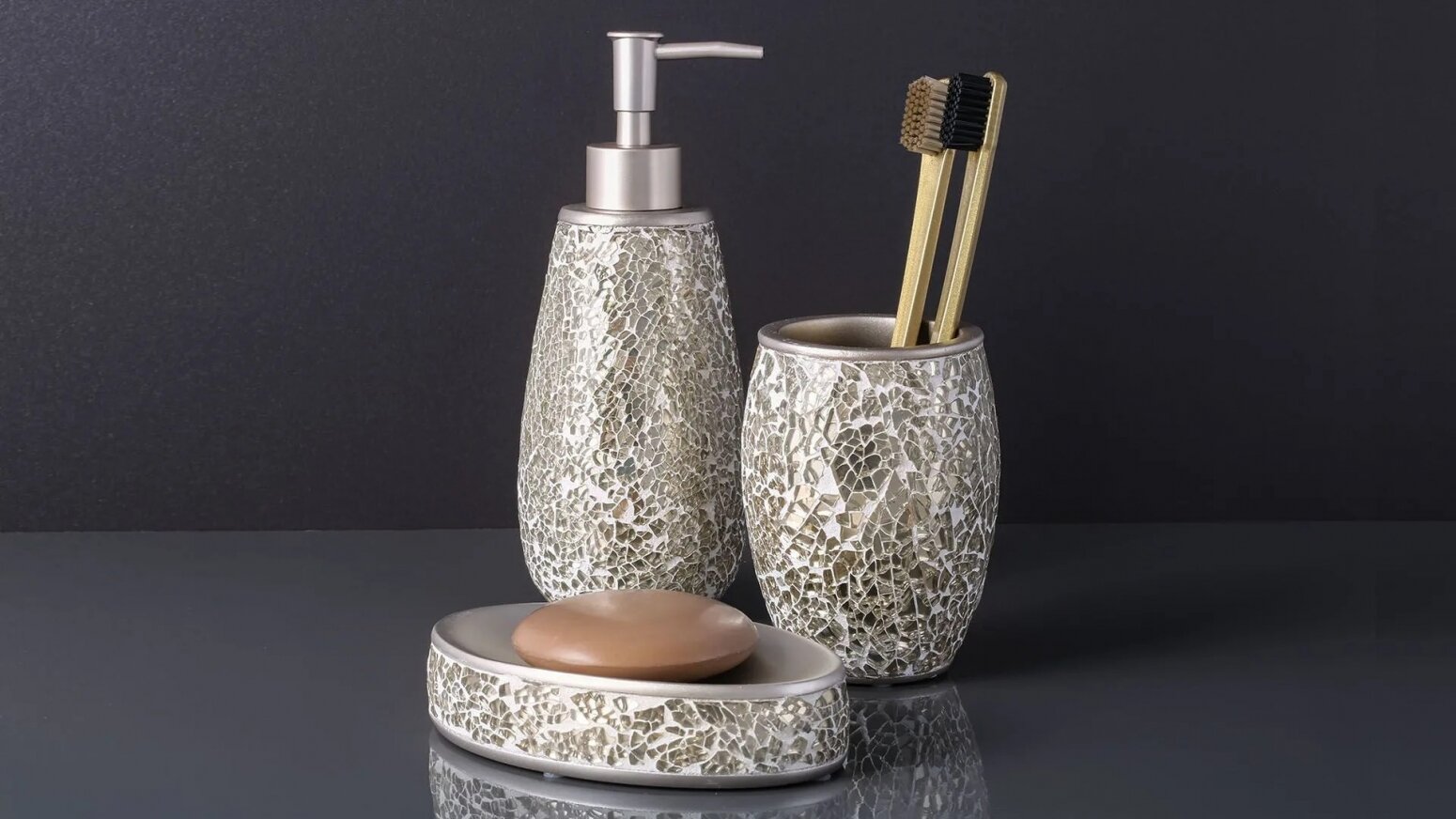 Флакон изготовлен из полирезина — смеси смолы, каменной крошки и красящего пигмента. Материал экологически безопасный, приятный на ощупь, устойчивый к ударам, хорошо переносит высокую влажность. Поверхность изделия глянцевая. Насос сделан из пластика.