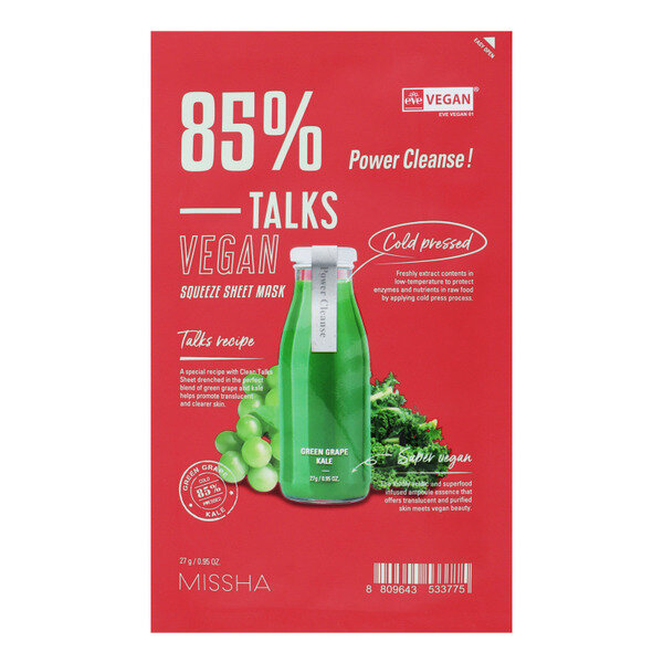Листовая маска пропитана смесью суперпродуктовых соков из зеленого винограда и капусты.