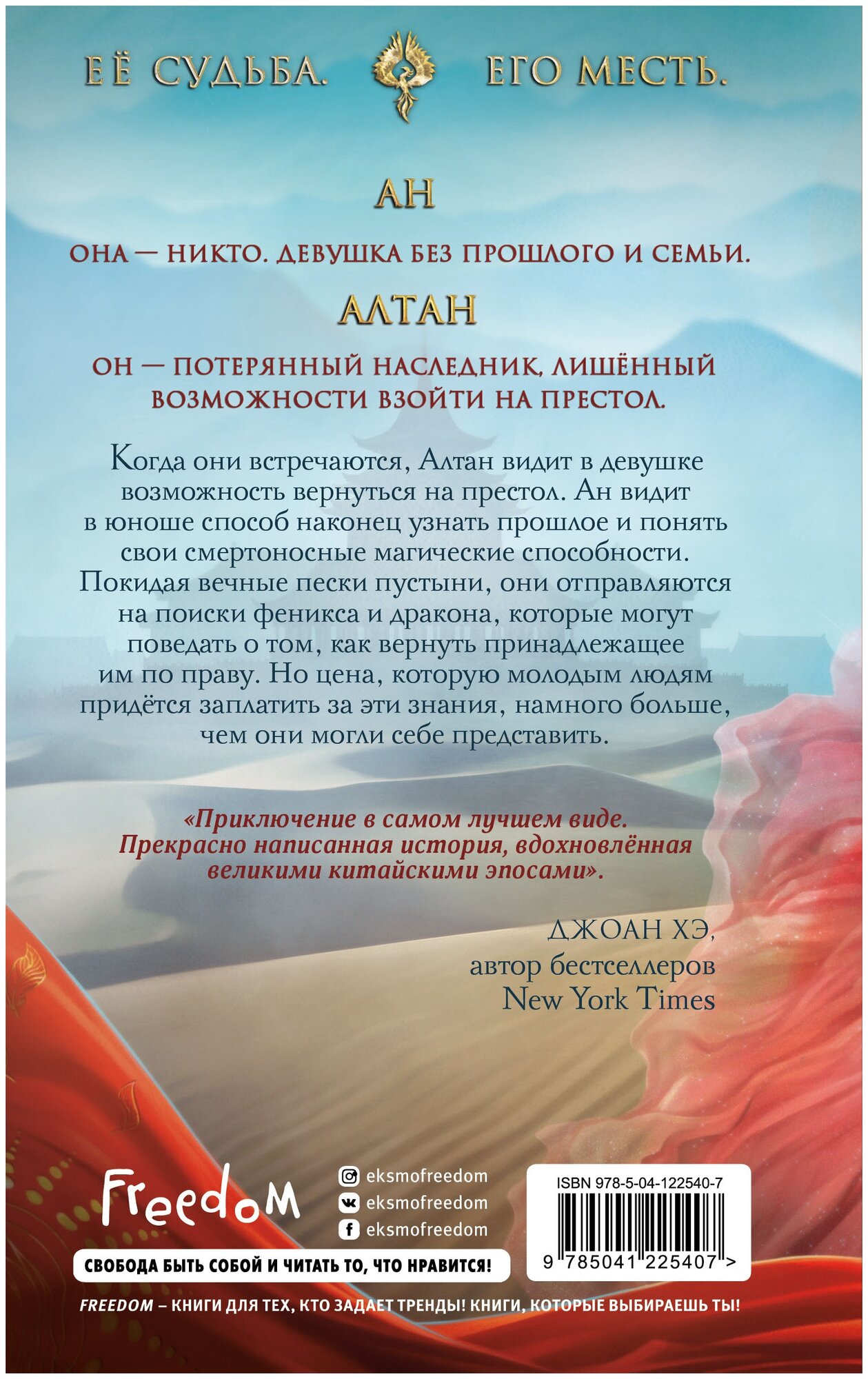 Её судьба. Его месть. Ан Она — никто. Девушка без прошлого и семьи. Алтан Он — потерянный наследник, лишенный возможности взойти на престол. Когда они встречаются, Алтан видит в девушке возможность вернуться на престол. Ан видит в юноше способ наконец узнать прошлое и понять свои смертоносные магические способности. Покидая вечные пески пустыни, они отправляются на поиски феникса и дракона, которые могут поведать о том, как вернуть принадлежащее им по праву. Но цена, которую молодым людям придется заплатить за эти знания, намного больше, чем они могли себе представить. С первых страниц автор отправляет нас в невероятное магическое приключение, погружая в китайский фольклор и мифологию! В основу книги легли эпосы о драконе Лун Ван и фениксе Фэнхуан. Это книга о магии, демонах, призраках и бессмертных созданиях подкупает красочностью повествования и деталями! Откройте для себя новые истории в лучших традициях «Аватара. Последнего мага воздуха». Настоящий подарок для всех поклонников китайского магического фэнтези! На дебютную работу Джун Ч. Л. Тан оставили только положительные отзывы авторы бестселлеров New York Times! «Эпическое приключение!» — Элизабет Лим, автор бестселлеров «Сплетая рассвет» и «Расплетая закат» «Приключение в самом лучшем виде. Прекрасно написанная история, вдохновленная великими китайскими эпосами». — Джоан Хэ, автор бестселлеров «Наследница журавля» и «Те, кого нам суждено найти»