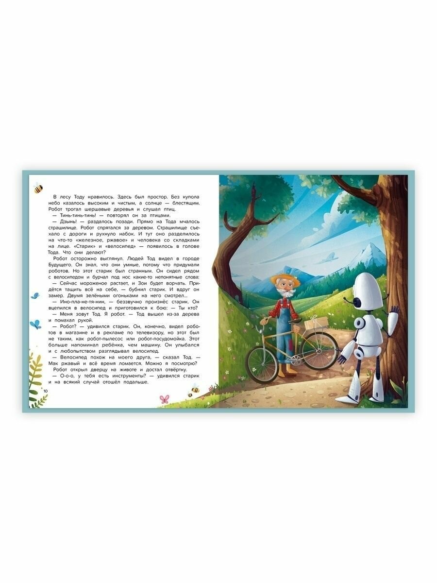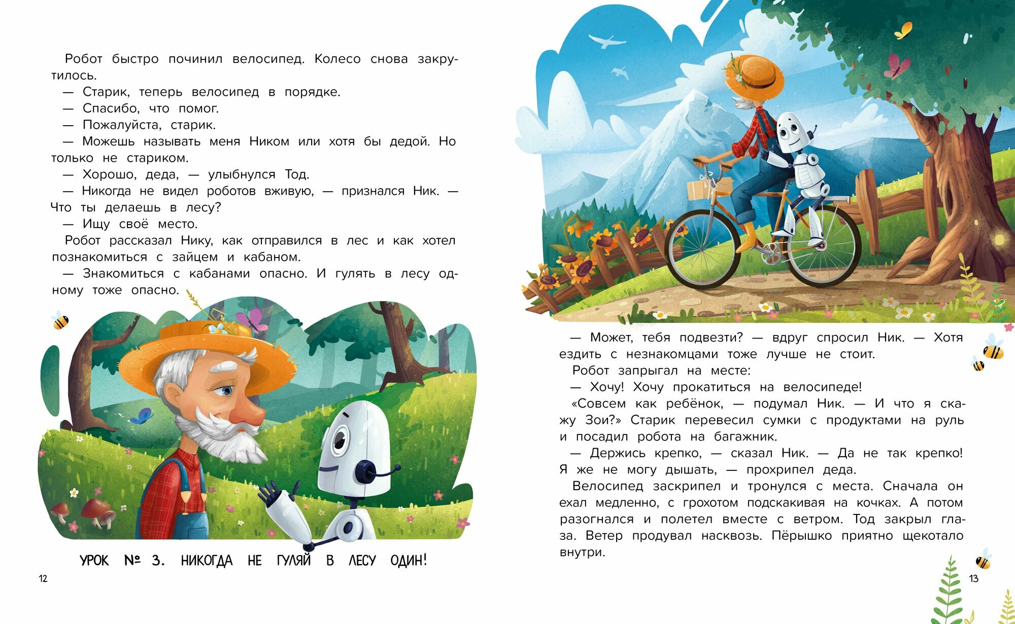 Книга удобного формата, бумага белая глянцевая без бликов. Добрая история про дружбу робота Тода, который искал себя и деда Ника. Хоть и написана простым языком (много простых предложений в буквальном смысле))), но есть скрытый смысл над чем можно подумать вместе с ребенком. В книге 18 небольших рассказов. Читать интересно, даже хочется продолжения! Ребенок 3х лет просит читать еще и еще, а она у меня уже в книгах знаток! Иллюстрации на каждой странице, есть и одна на целый разворот, очень милые, понятные, яркие. Шрифт крупный, удобно читать и ребенку. Возрастной контингент от трех лет. Книгу однозначно советую в детскую библиотеку!