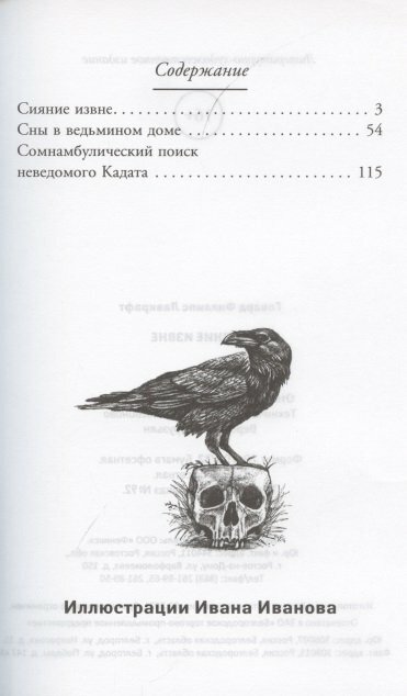 .книга содержит 3 коротких рассказа, первые два рассказа "сияние извне"и "сны в ведьмином доме" неплохие, интересные, мне понравились. когда я начала читать третью историю "Сомнабулический поиск неведомого Кадата" мое мнение о этой книге ухудшилось, она скучная, неинтересная и непонятная, пока читала, то заснула. я думаю, что эти рассказы для тех кто фанатеет по Лавкрафту.