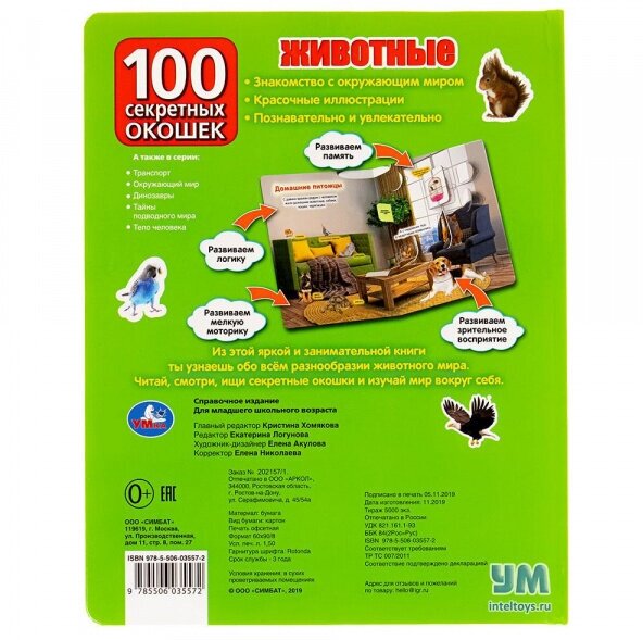 ЖИВОТНЫЕ. 100 ОКОШЕК ДЛЯ МАЛЫШЕЙ. ФОРМАТ: 222Х282 ММ. ОБЪЕМ: 12 КАРТОННЫХ СТР. в кор.12шт (Хомякова К. Хохлова Е., Е. Логунова); Умка, 2019