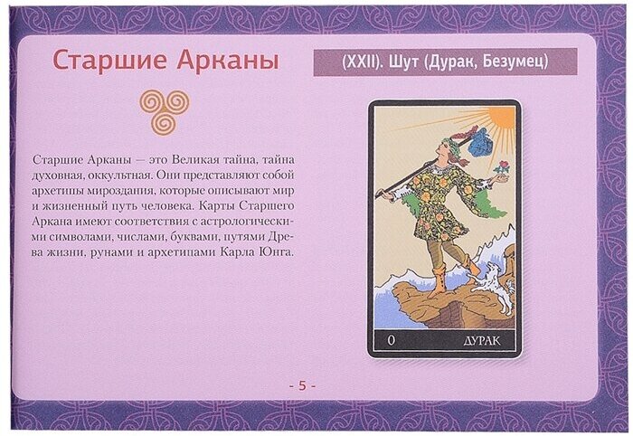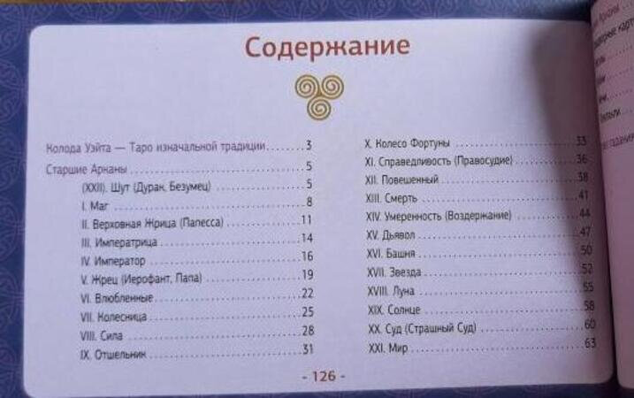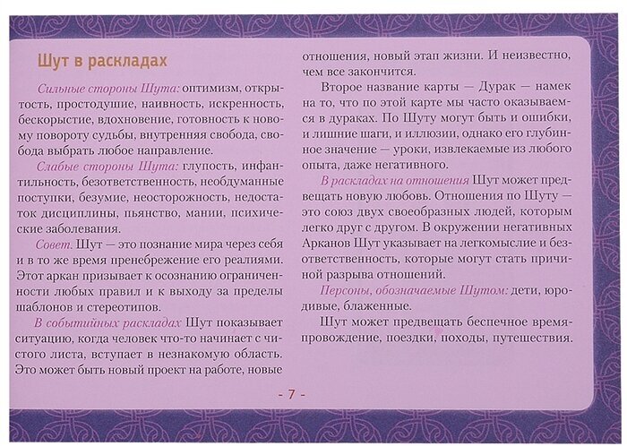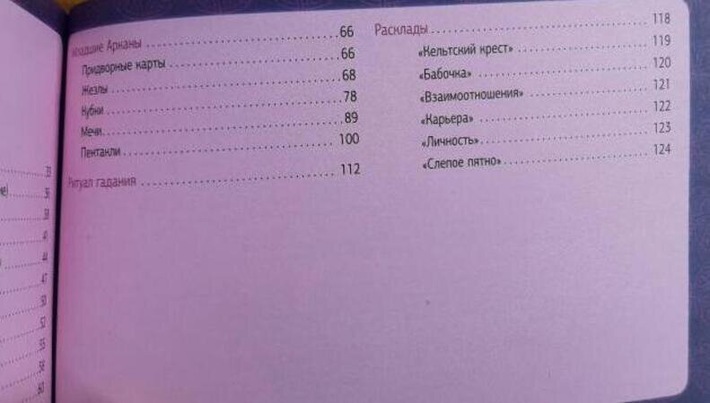 Книжечка и колода упакованы в коробку. Она не очень плотная, поэтому, если покупаете в подарок, забирайте заказ сами, что бы не помялась при транспортировке. Книжечка в мягкой глянцевой обложке, все странички цветные. Колода дополнительно обернута слюдой. Карт 78шт, запасных пустых нет.