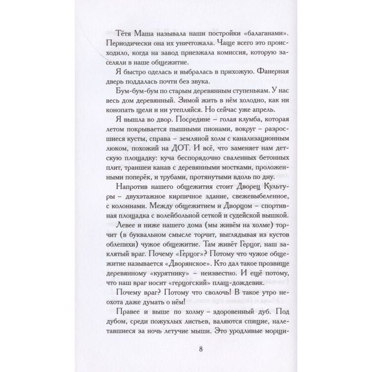Собственно, малолетние дети этих матерей-одиночек и есть главные герои повести. Да, жизнь скудная, пейзаж безрадостный – сухая земля, нагромождения бетонных плит, заросший тростником берег озера – но дети есть дети. Проделки главное героини Тани и ее бедовых друзей-подружек не раз заставят вас улыбнуться во время чтения. Но и ужаснуться тоже. Вот ведь, паразиты! Что делают, А?