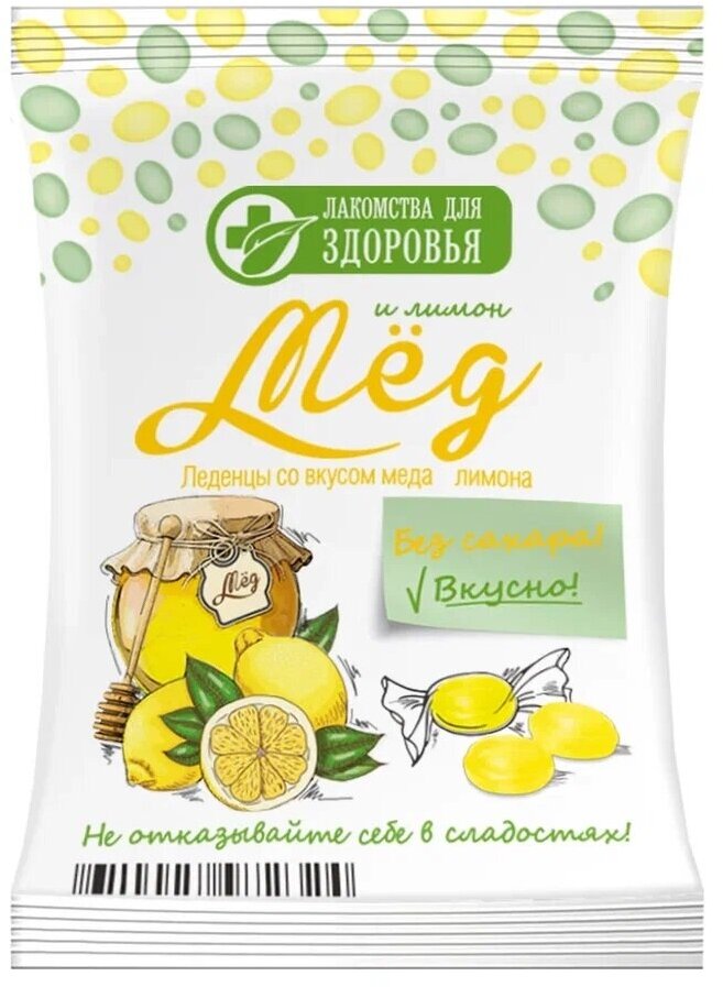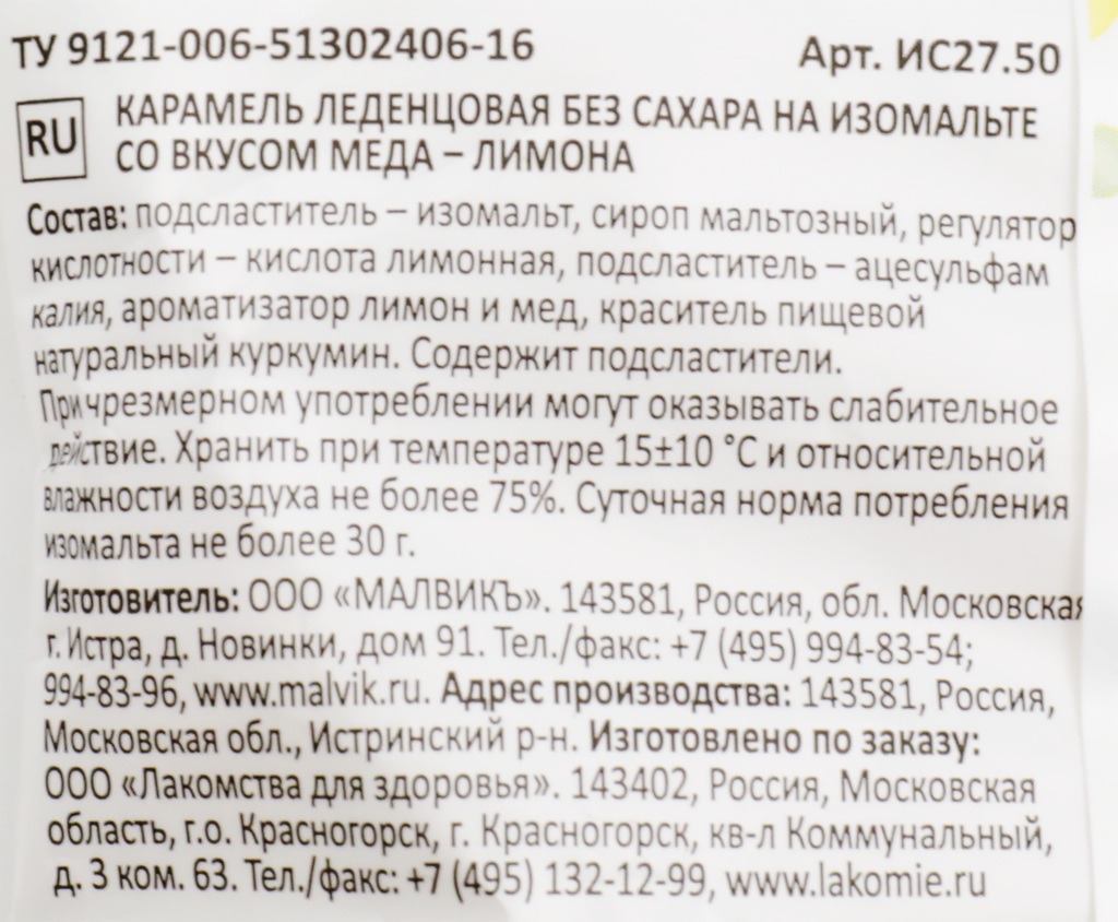 Карамель леденцовая без сахара на изомальте со вкусом меда-лимона Лакомства для здоровья 50г ООО Малвик (1617558)
