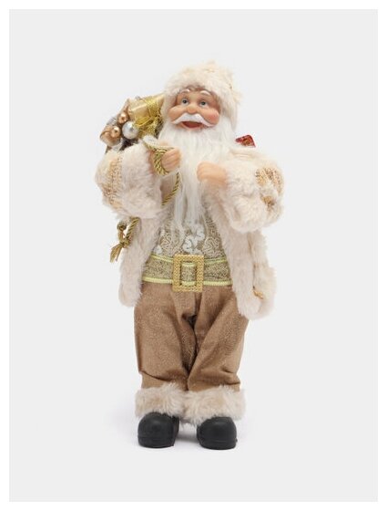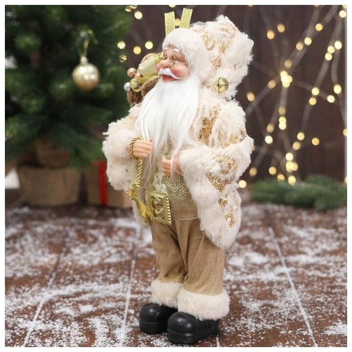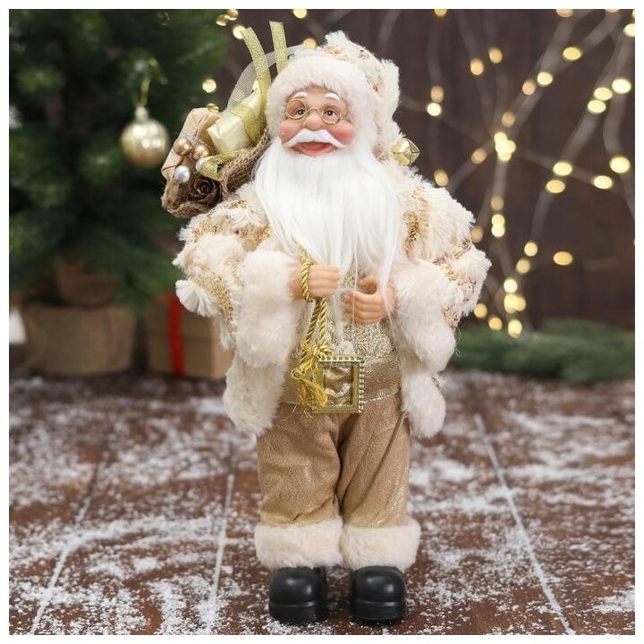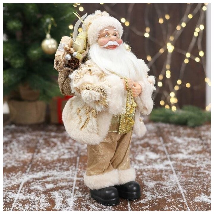 Модель: Дед Мороз В бело-золотистом костюме блеск с подарками 15х30 см